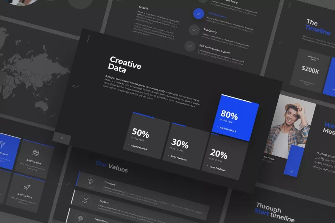 前段时间苹果更新了ios13,增加了暗色系,也带起了一波暗色系流行趋势,各大app/网站也增加了暗色风格,在某些情境下,个人觉得暗色确实要比亮色更有吸引力。第五套模板就是典型的暗色系,简单的线条,渐变色的点缀,两个字高级。