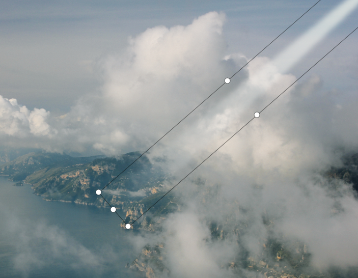 改成渐变填充,同光圈一样,一边为白色,一边为浅色,并调整两边透明度至合适的情况,找到光源的位置,把光束按照光芒照射的方向放好。