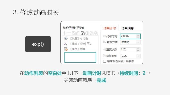 3. 最后在动作列表的空白处中单击一下,切换到动画计时选项,持续时间改为2秒即可