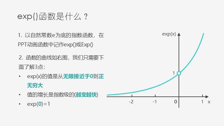 在PPT中的动画函数除了常见的sin、cos、tan、floor、ceil、rand等之外,还有几个比较冷门但却很好玩的函数。今天我们介绍以自然常数e为底的指数函数:Exp()