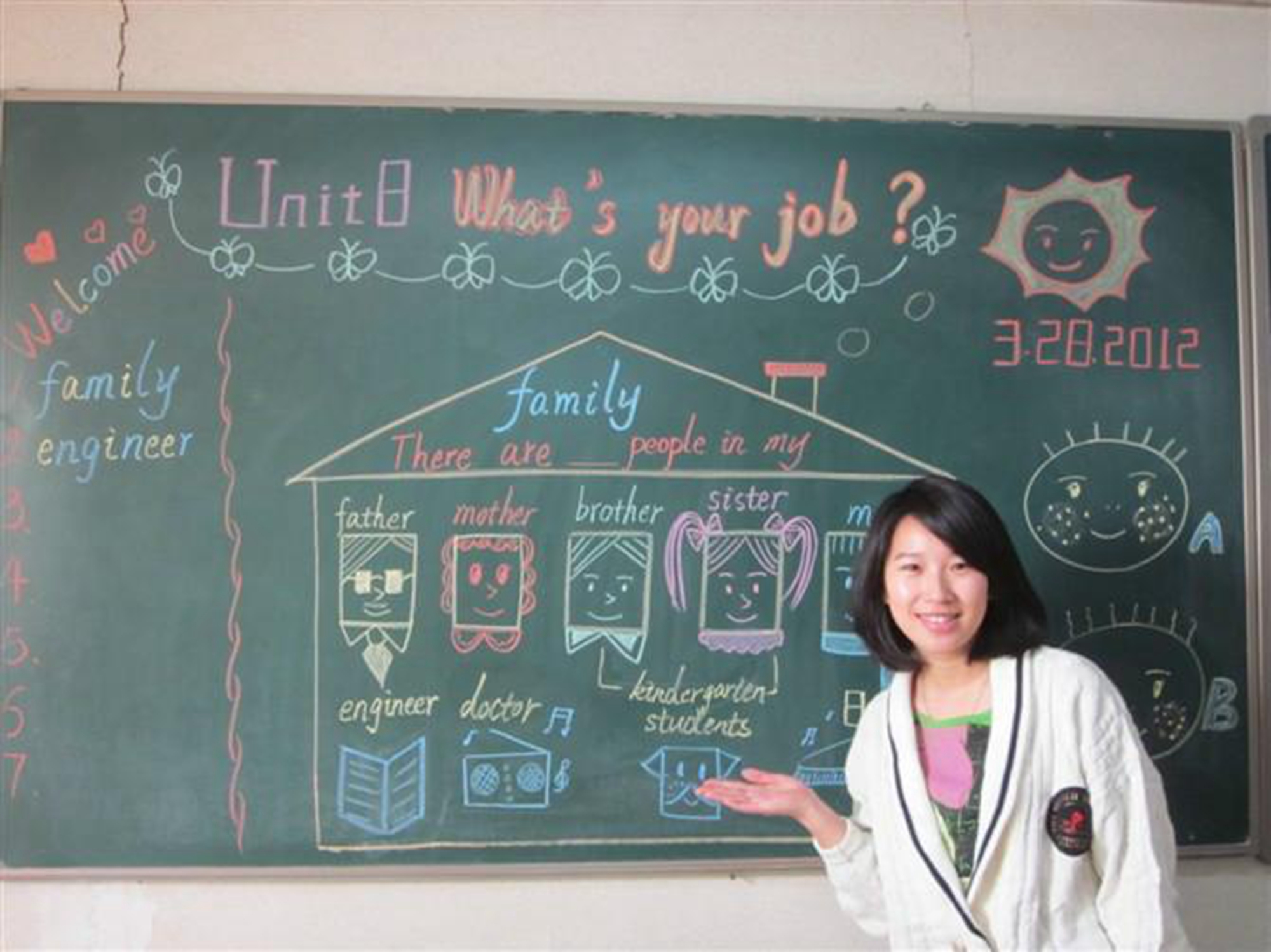 英语板书与其他科目的板书相比更要求英语老师付出更大的心血。一来是英语的粉笔字较为难写,二来是黑板上并没有横线,只能够靠着老师的感觉去写。