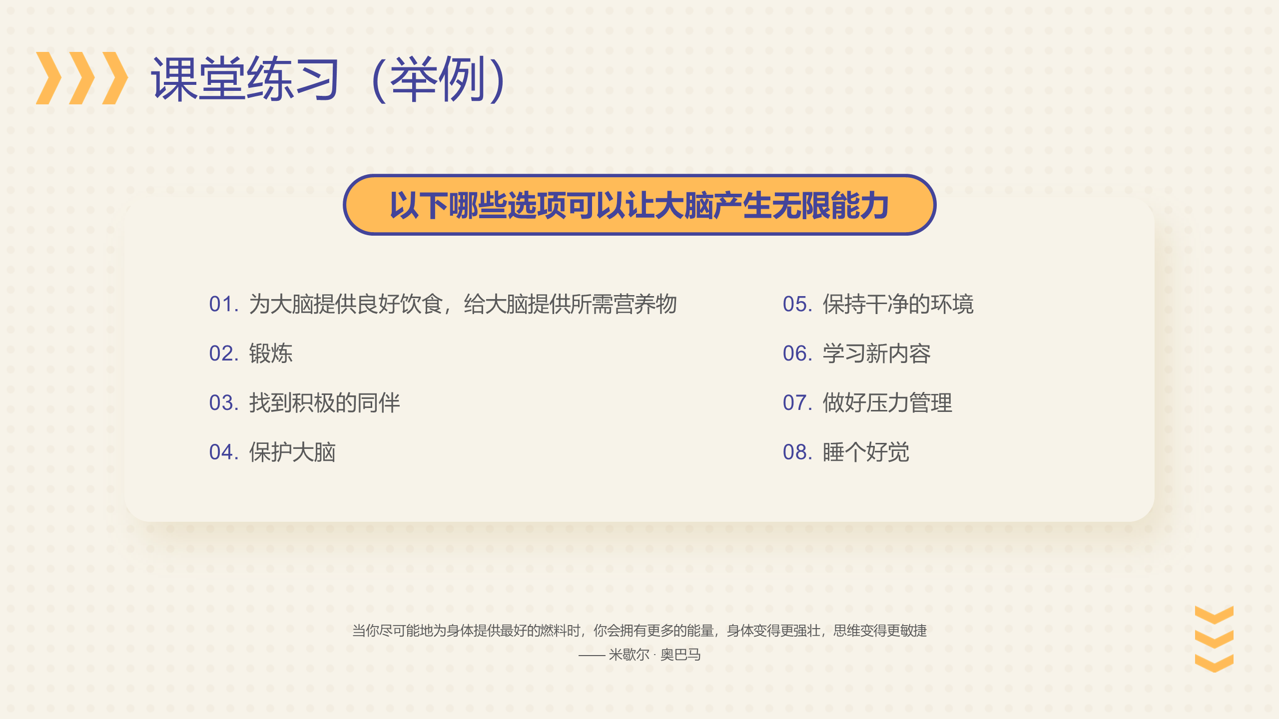 在课程中,如果有结合本节内容的练习、思考页面,会更好的让学员理解和消化学习内容,感受到自己的进步,更有代入感,也可以起到互动的作用。
