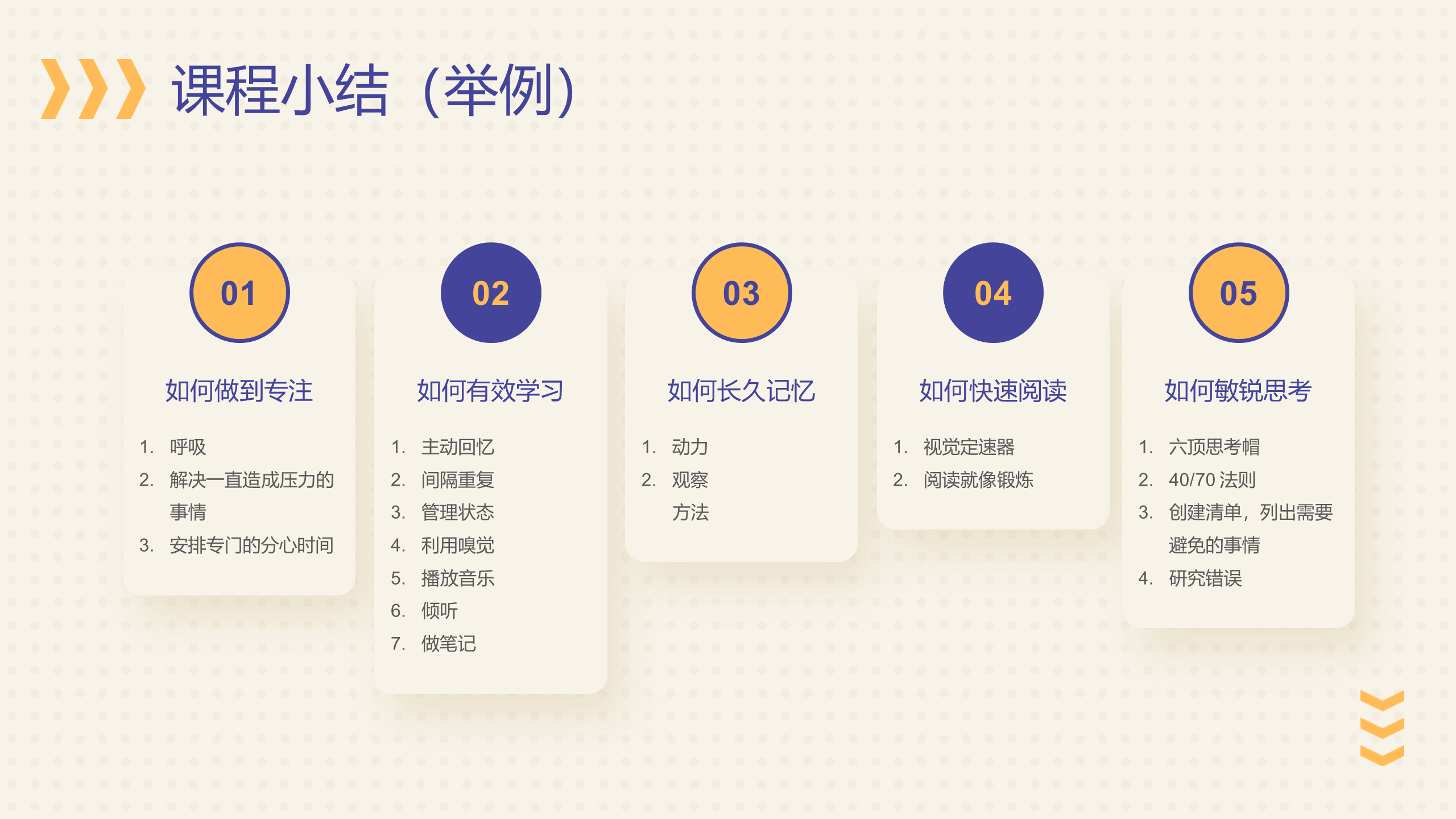 在每节最后,一定要总结这节课程的核心知识点,要简洁、凝练,让学员清楚知道这节课一定要掌握什么,学到什么,起到承前启后的作用。