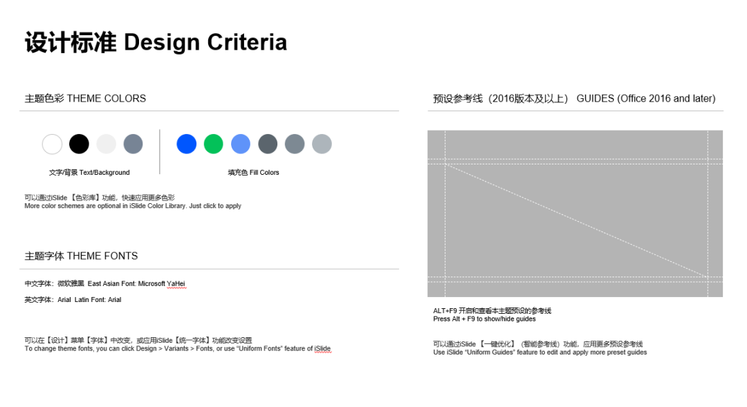 也可以参考iSlide每一套主题模板的末尾,都有一个设计标准的说明页,而对于长期高频需要写PPT文档的朋友,建议可以将更多的页面元素样式风格做成标准,以保持设计上的统一。