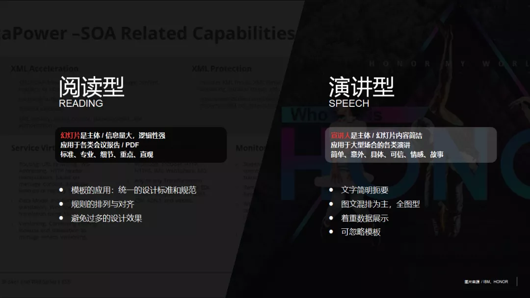 PPT的类型在之前的教程中介绍过主流的“阅读型”和“演讲型”,不一样的PPT类型设计思路,版式布局和注意事项都是有差异的