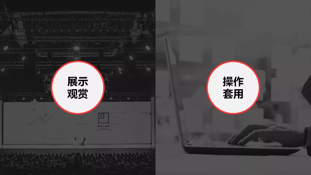 除了上文提到的“演讲型”和“阅读型”,还需要明确这个PPT是用来“展示观赏”还是用来“操作套用”的,不一样的目的,需求,设计时考虑的点也是不一样的