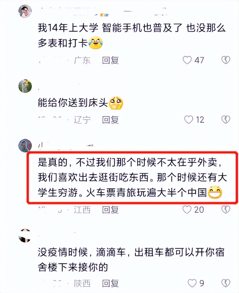 学生只能天天吃食堂,偶尔定个外卖,还要到校门口去取。殊不知在疫情以前,学生的外卖不仅能送到寝室门口,甚至能直接送到学生的床头。网约车也能到宿舍楼下接学生,不用学生大包小裹跑到校门外再打车。