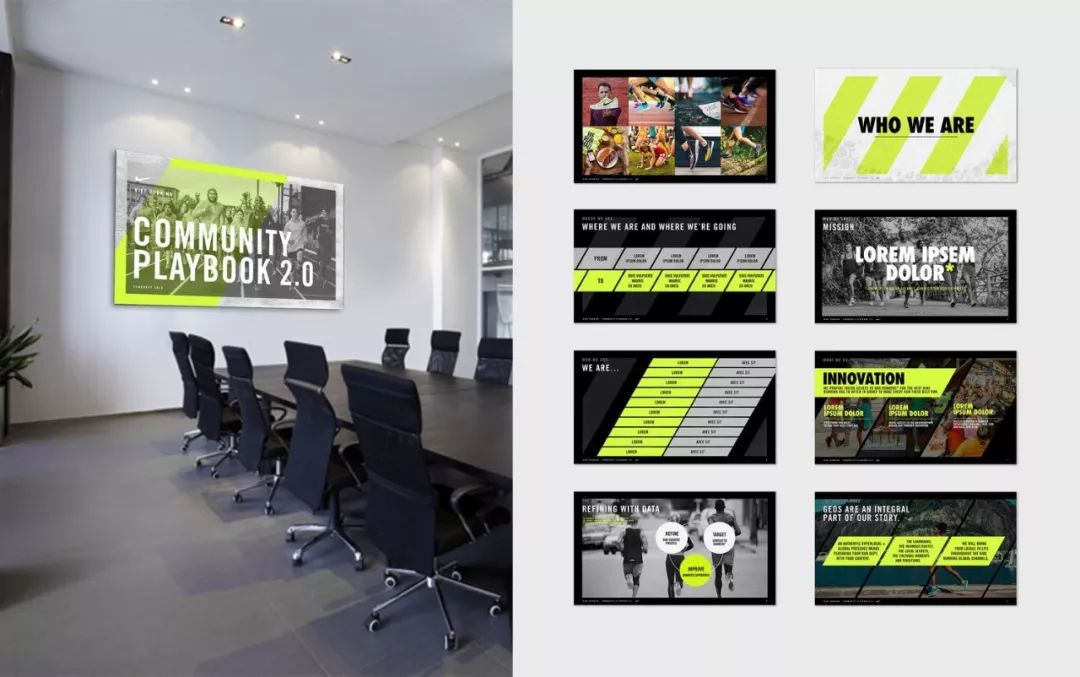 同样地,再比如像这份运动风格的 PPT 中,为了更好地呈现出运动感,也是一样的方式: