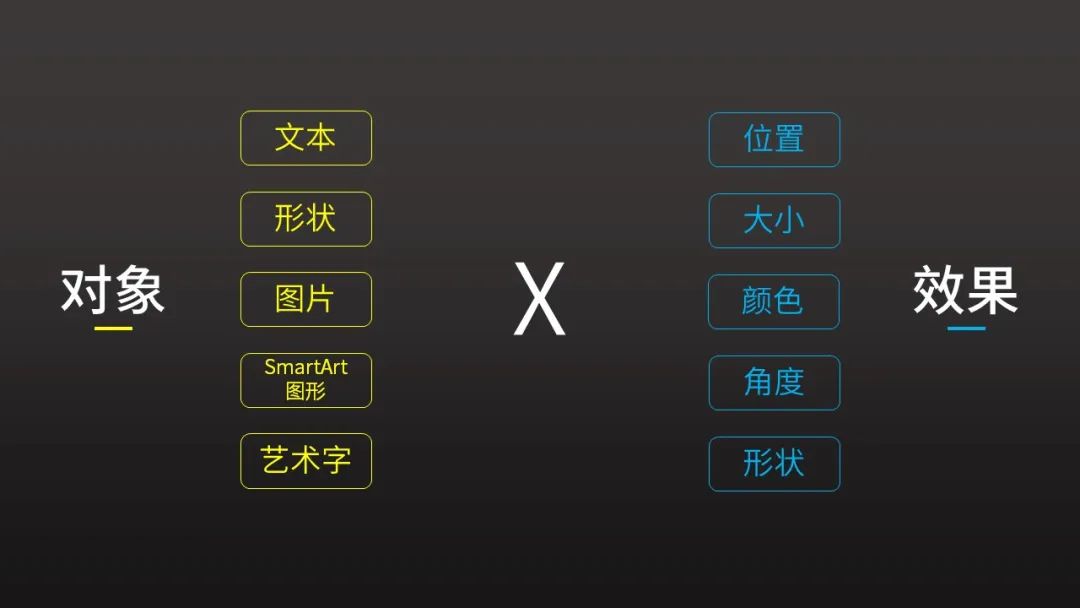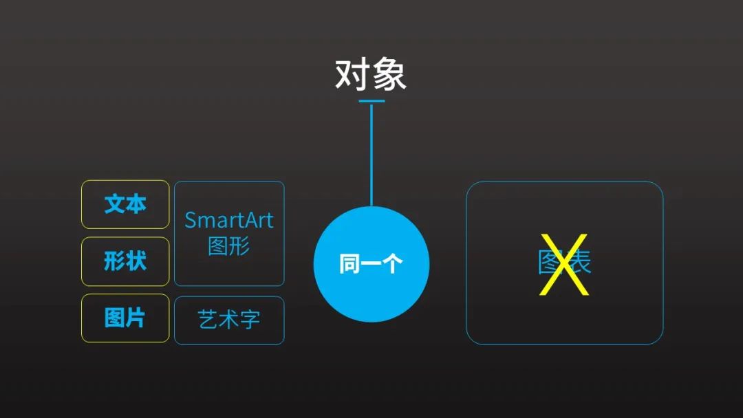 文本,形状,图片,SmartArt图形和艺术字,其中文本,形状,图片常用。