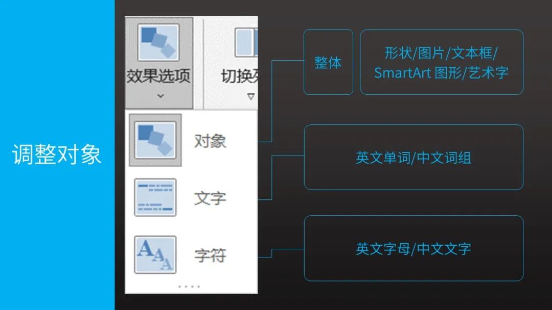 这个效果选项有3个子项目:分别是对象,文字和字符。