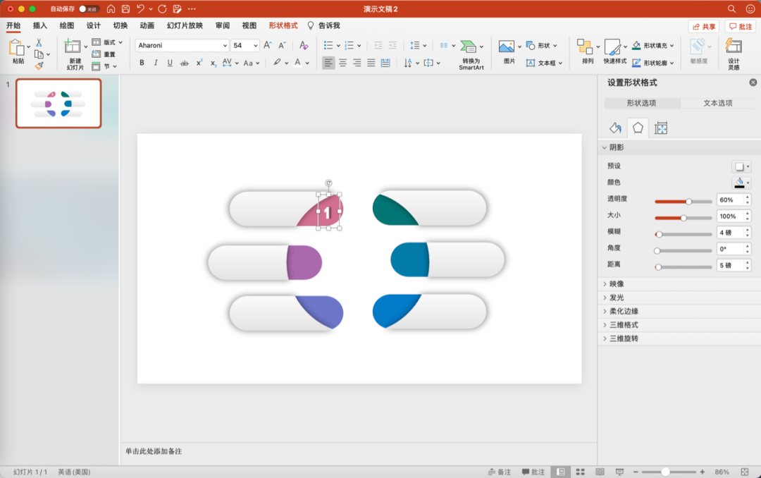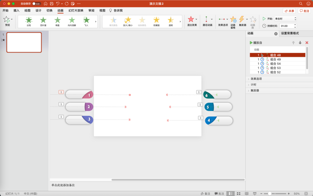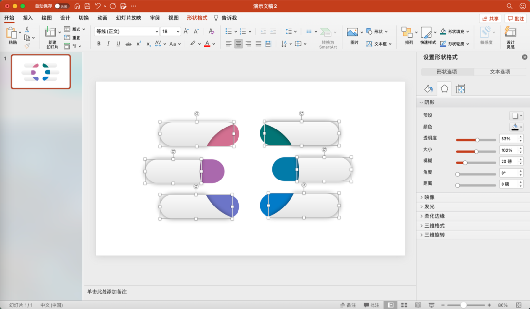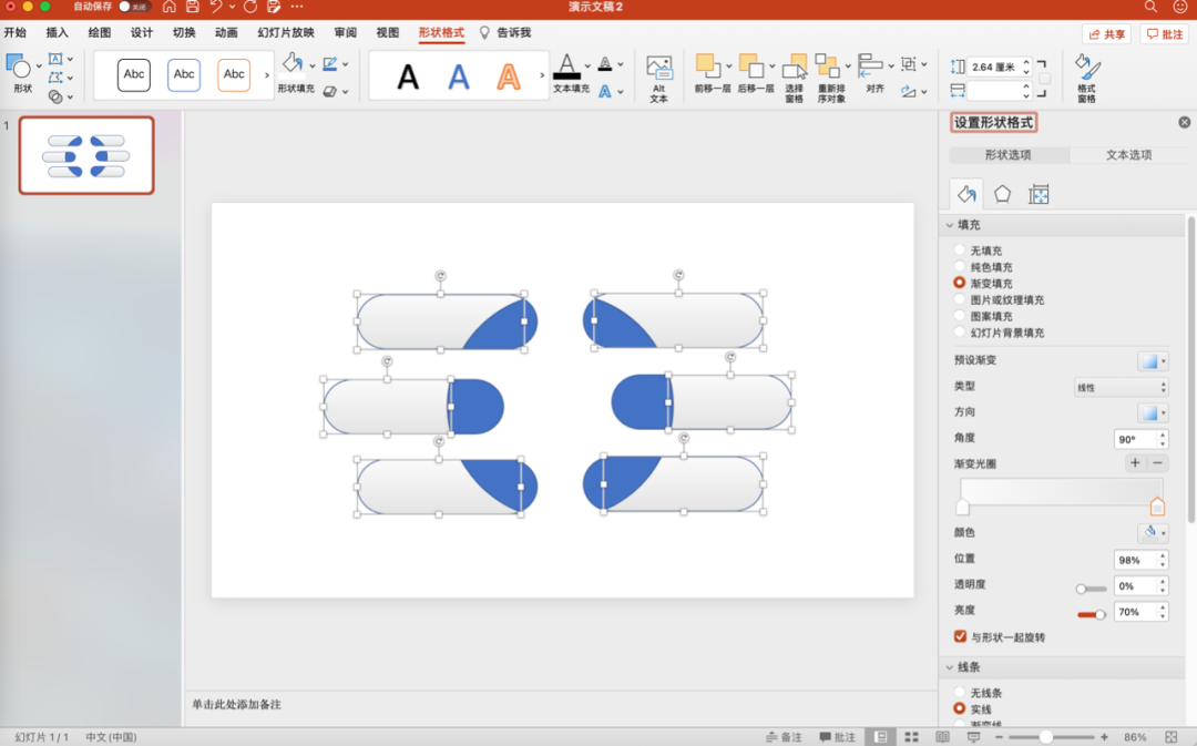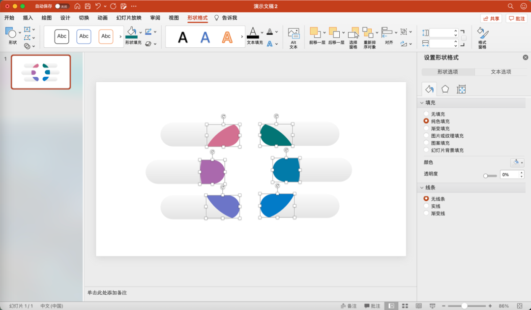 选中六个圆角矩形,进行设置:填充渐变色、去掉矩形的线条。