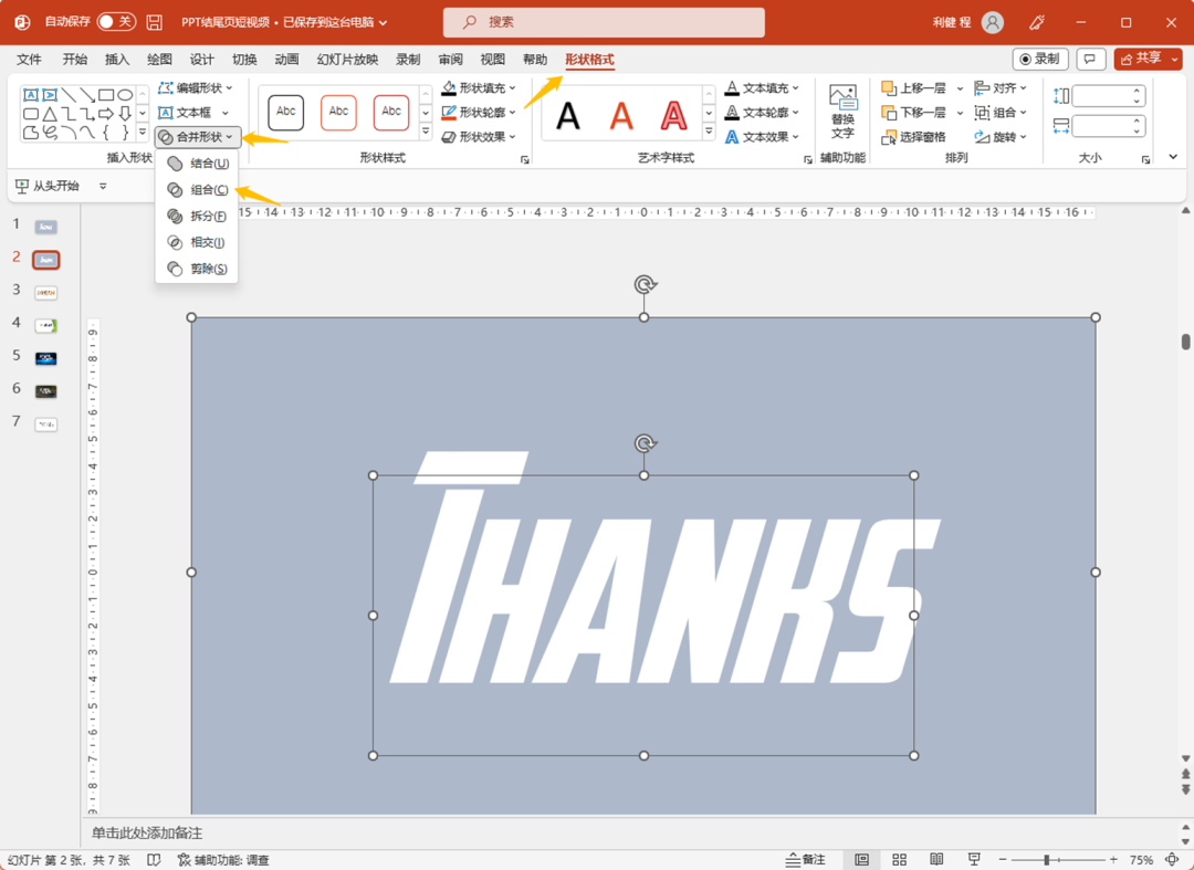 然后我们选中形状,再同时选中文本,点击形状格式 — 合并形状 — 组合。