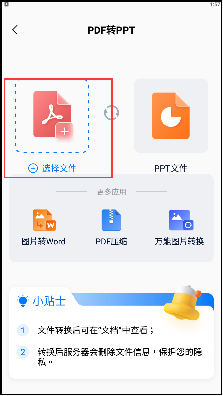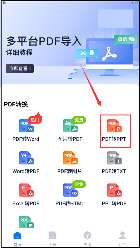 第一步 我们将它在手机上安装好就能使用啦,安装好了就以把它打开使用啦,我们在打开的首页就能看到【PDF转PPT】这个功能,点击一下。
