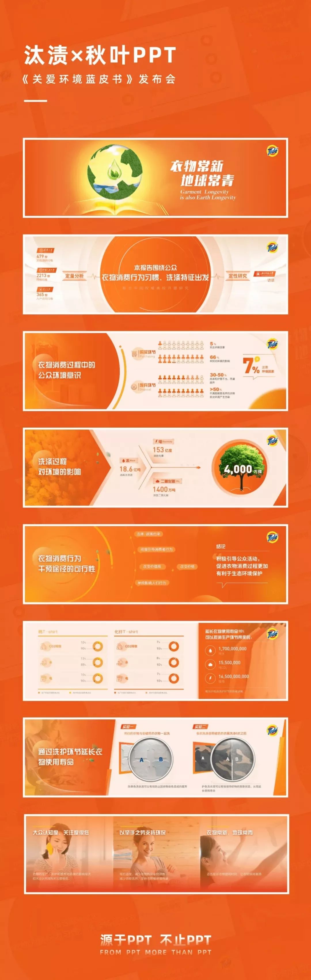 比如说我们的定制团队为汰渍发布会设计的 PPT,就充分地运用了品牌色橙色作为视觉锤。