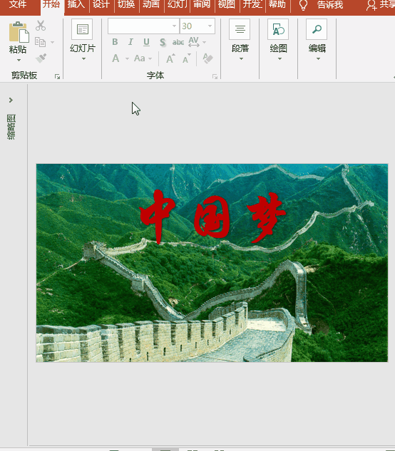 执行“插入”菜单-“文本”-“文本框”-“横排文本框”,输入文字“中国梦”,设置字体为华文行楷、大小为150磅、加粗、阴影、深红色放置于幻灯片正中上方。