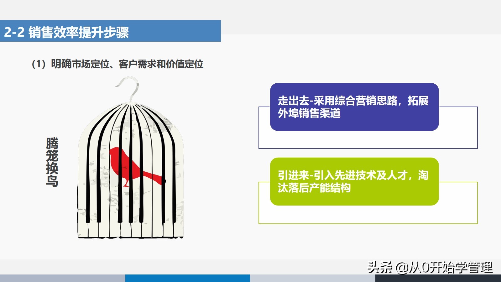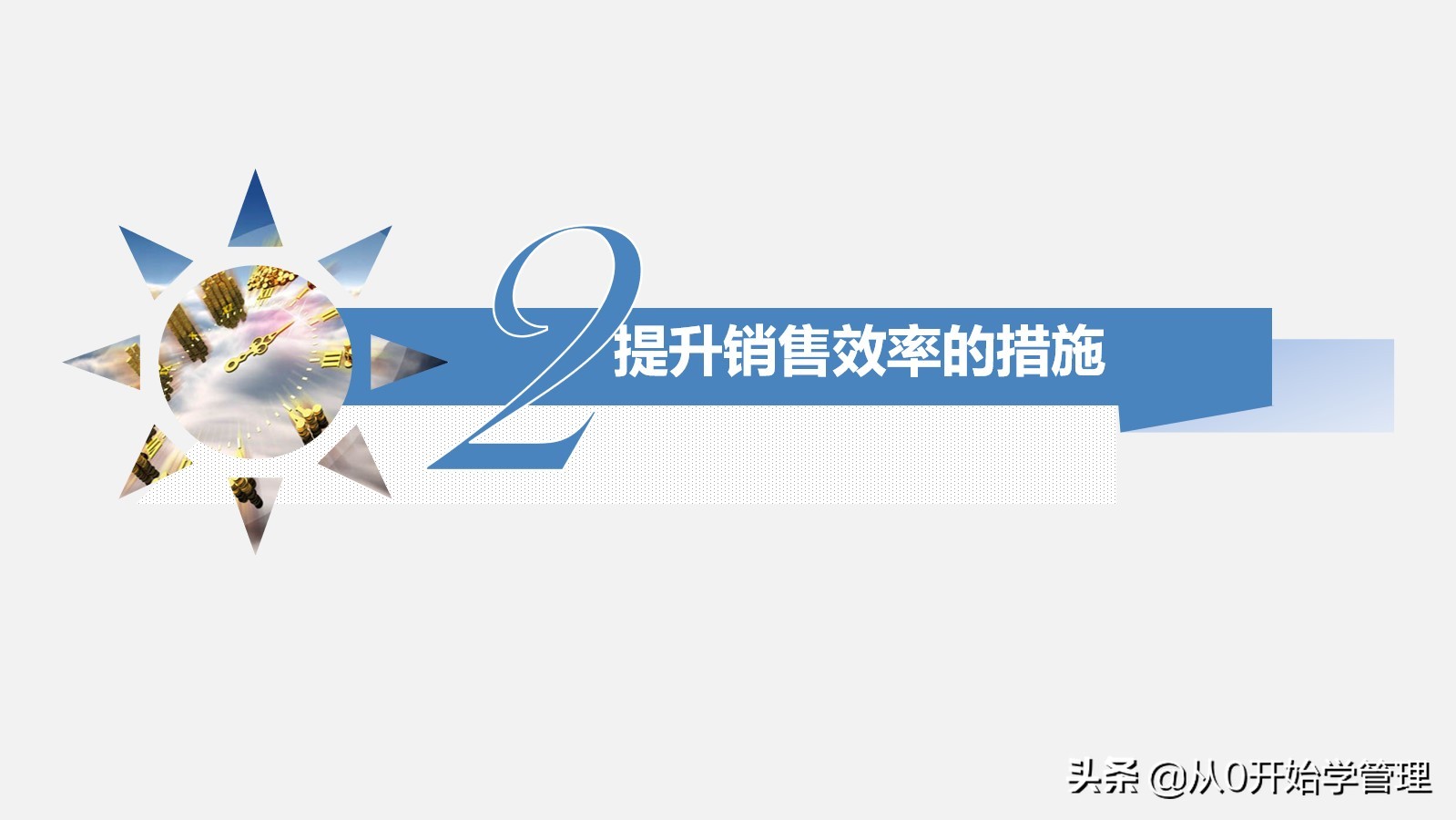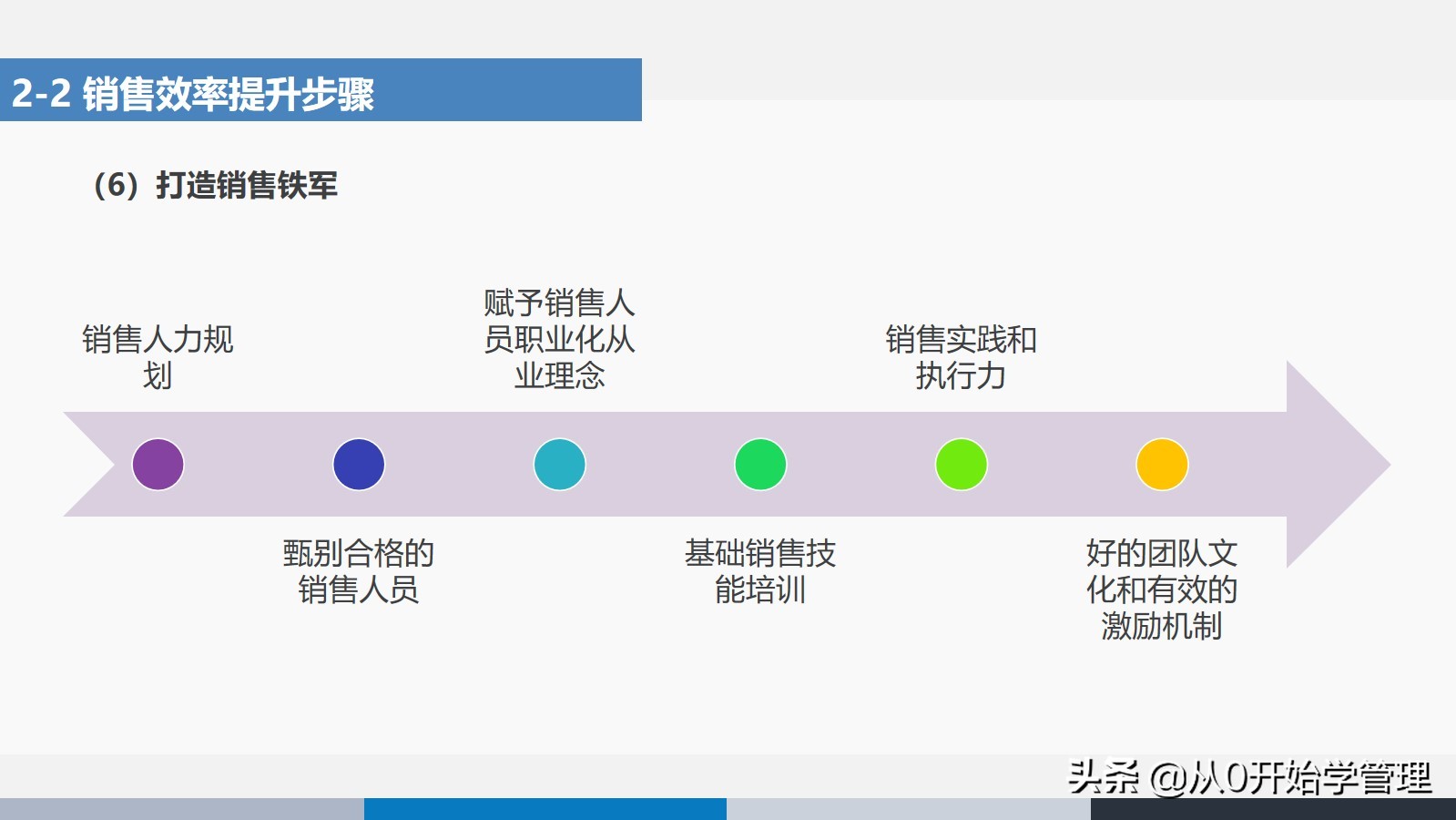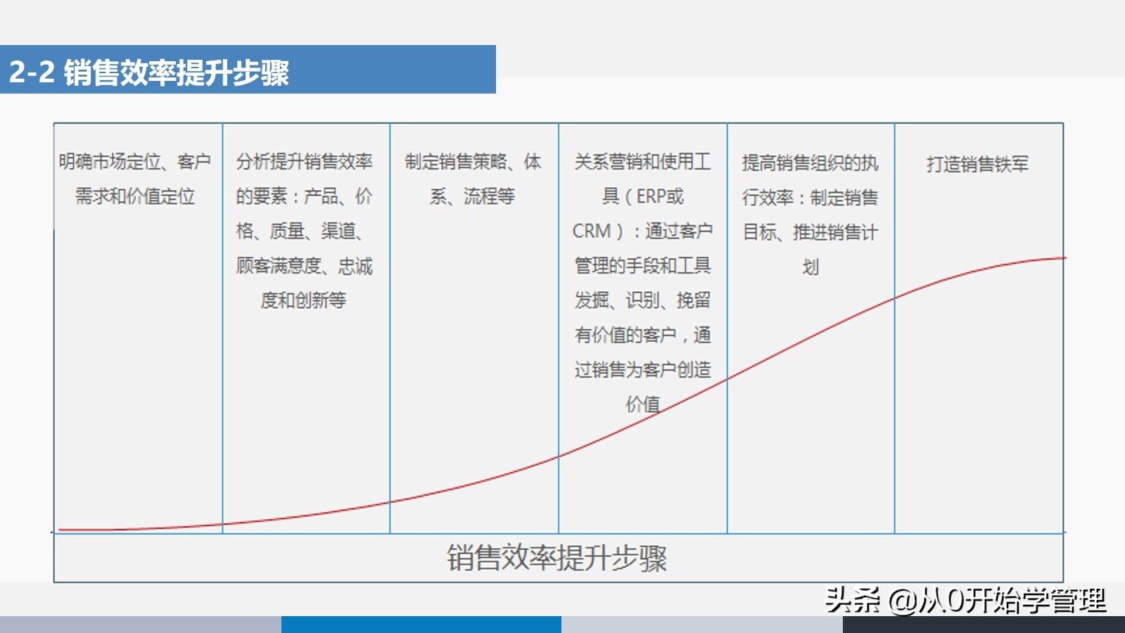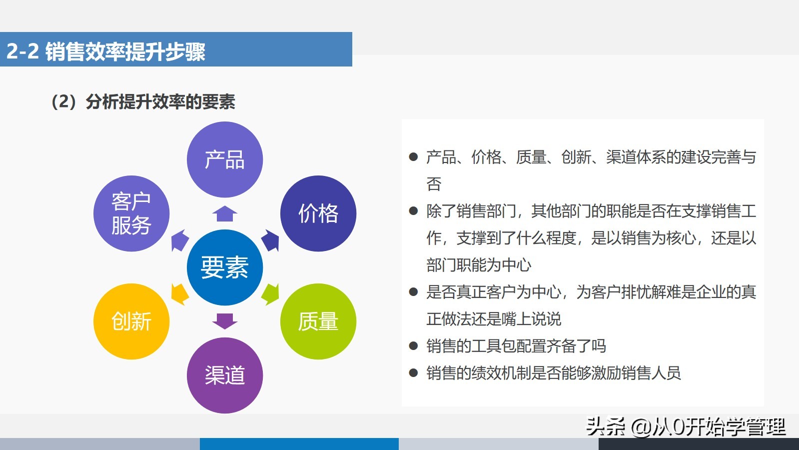 2、销售效率提升步骤: a、明确市场定位、客户需求和价值定位 b、分析提升效率的要素 c、制定销售策略/体系/流程 d、关系营销和使用工具 e、提高销售组织的执行效率 f、打造销售铁军