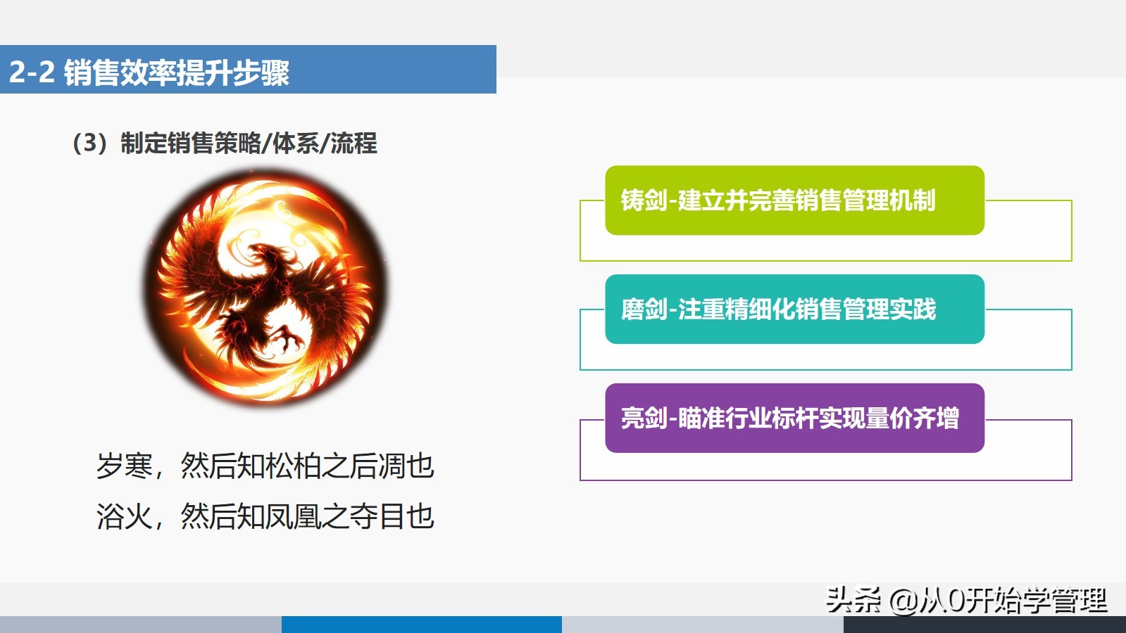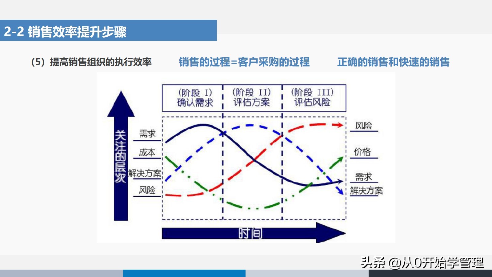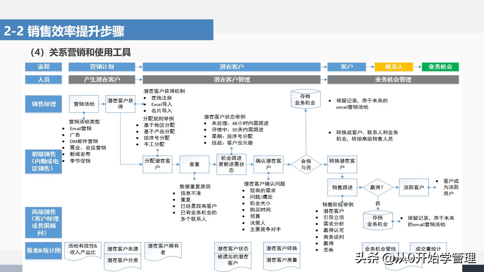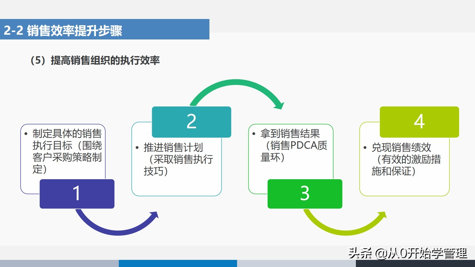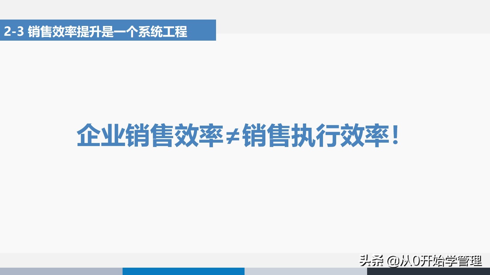 2、销售效率提升步骤: a、明确市场定位、客户需求和价值定位 b、分析提升效率的要素 c、制定销售策略/体系/流程 d、关系营销和使用工具 e、提高销售组织的执行效率 f、打造销售铁军