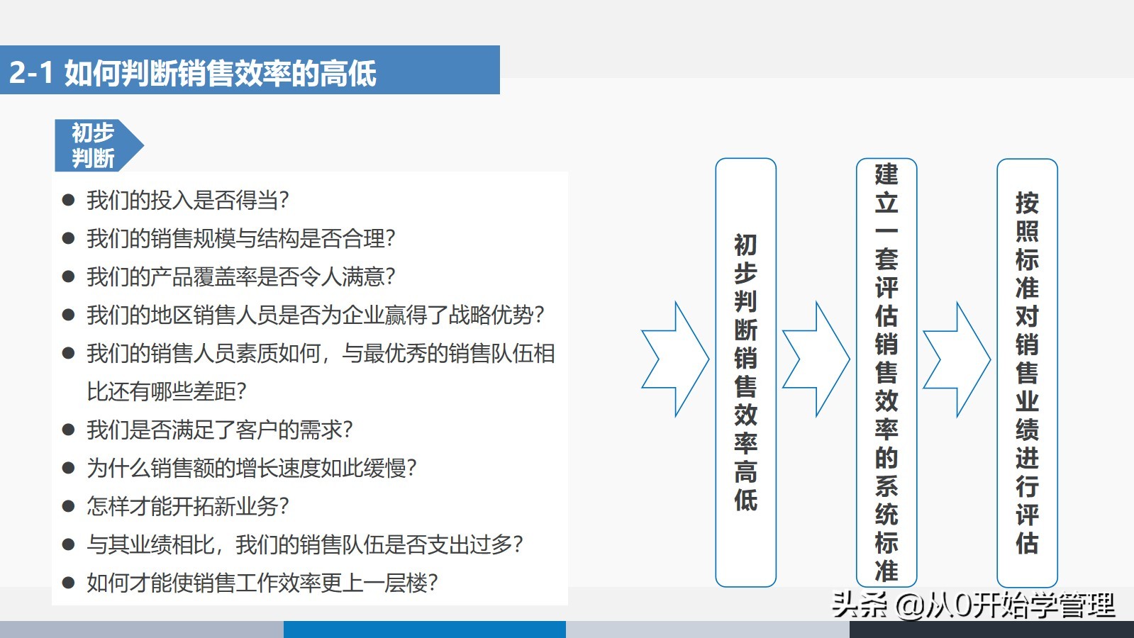 1、如何判断销售效率的高低: a、初步判断销售效率高低 b、建立一套评估销售效率的系统标准 c、按照标准对销售业绩进行评估