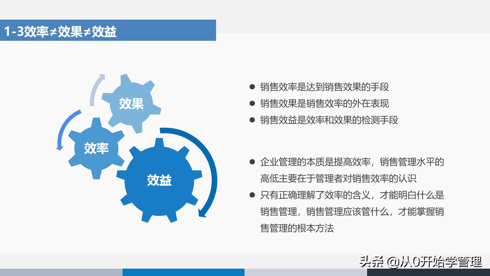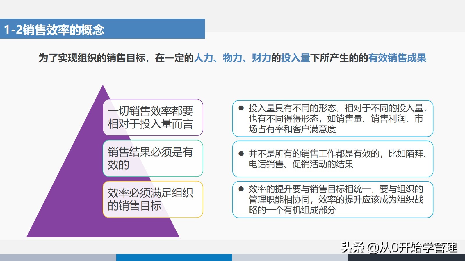 1、概念:为了实现组织的销售目标,在一定的人力、物力、财力的投入量下所产生的的有效销售成果