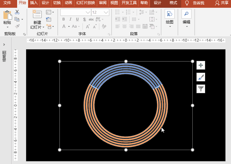 选择图表下方的橙色圆环,设置填充为“无填充”,选择其他圆环设置“无填充”,或按F4重复之;