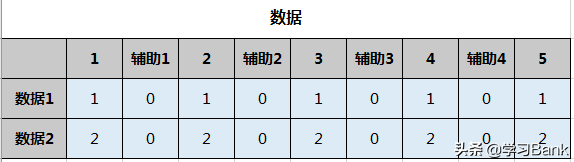 原始数据为2行5列数据,分别为1和2,在每列数据之间插入辅助数列,数值均为0。
