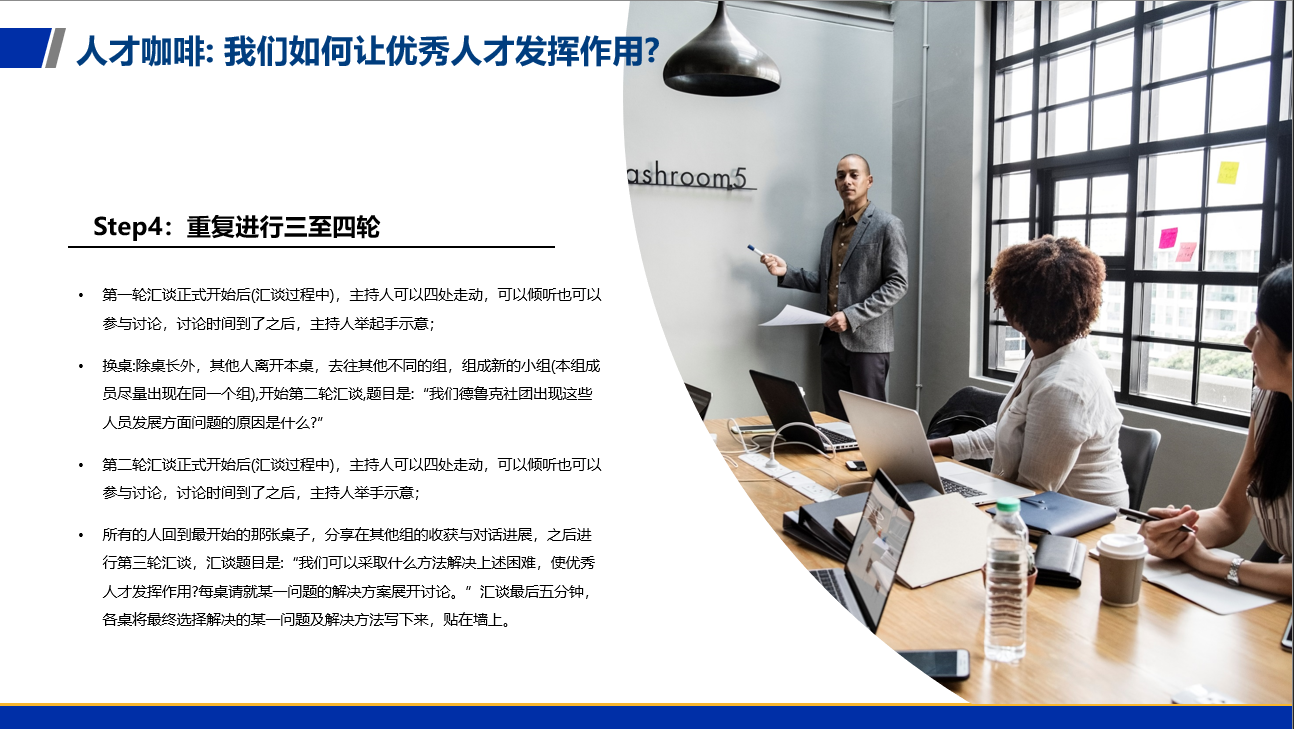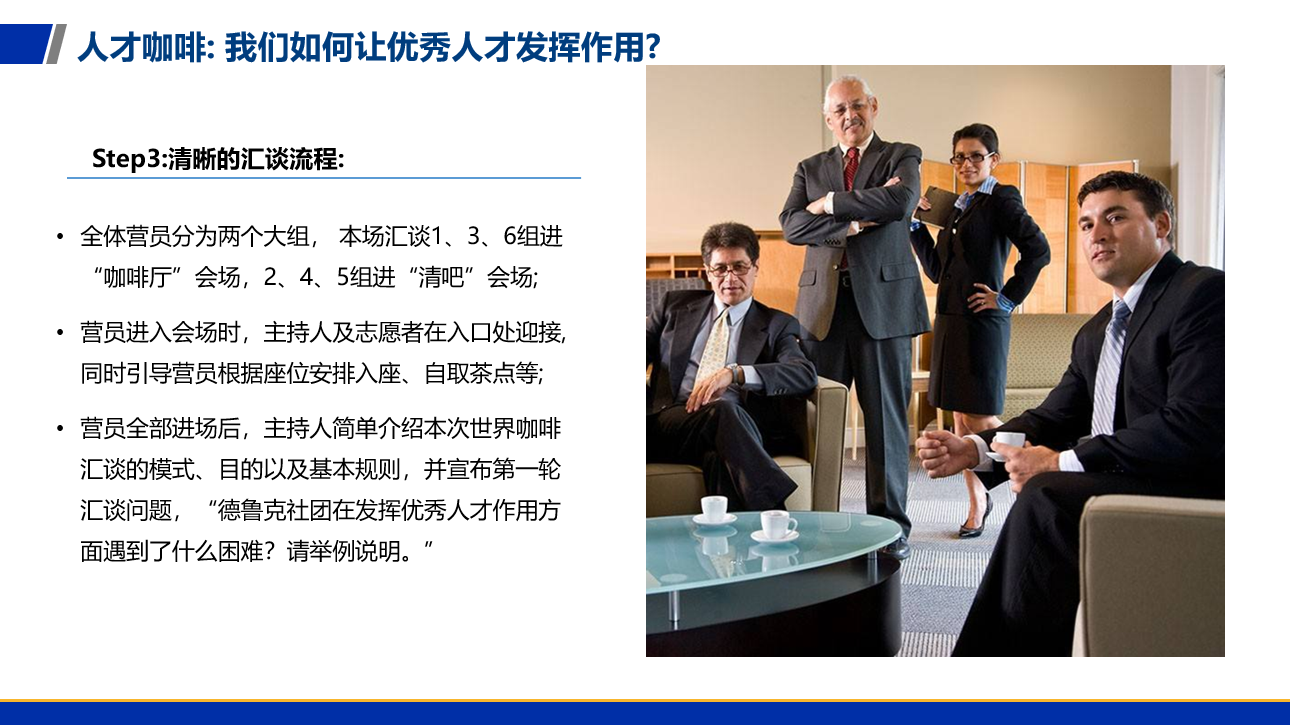 营员全部进场后,主持人简单介绍本次世界咖啡汇谈的模式、目的以及基本规则,并宣布第一轮汇谈问题,“德鲁克社团在发挥优秀人才作用方面遇到了什么困难?请举例说明。”