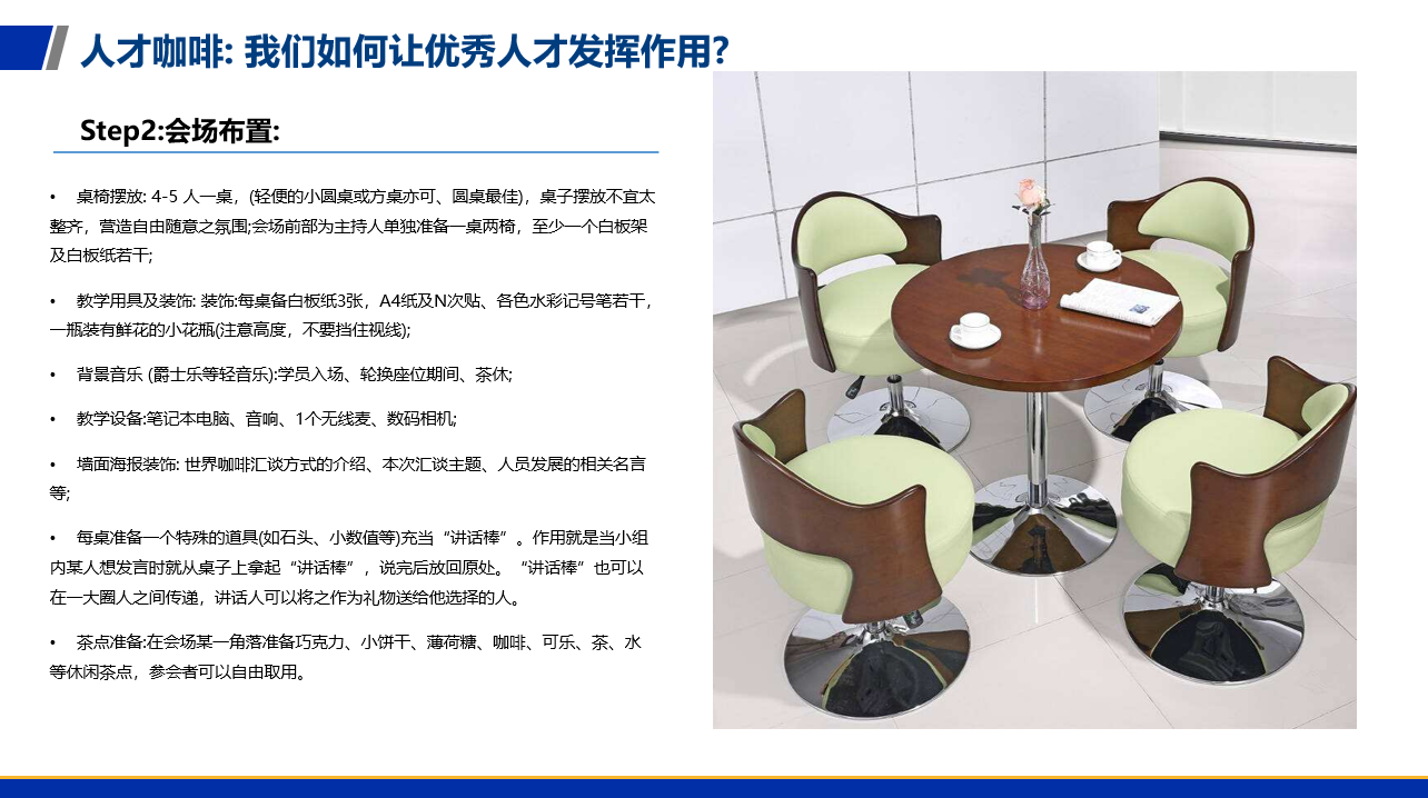 桌椅摆放: 4-5 人一桌,(轻便的小圆桌或方桌亦可、圆桌最佳),桌子摆放不宜太整齐,营造自由随意之氛围;会场前部为主持人单独准备一桌两椅,至少一个白板架及白板纸若干;
