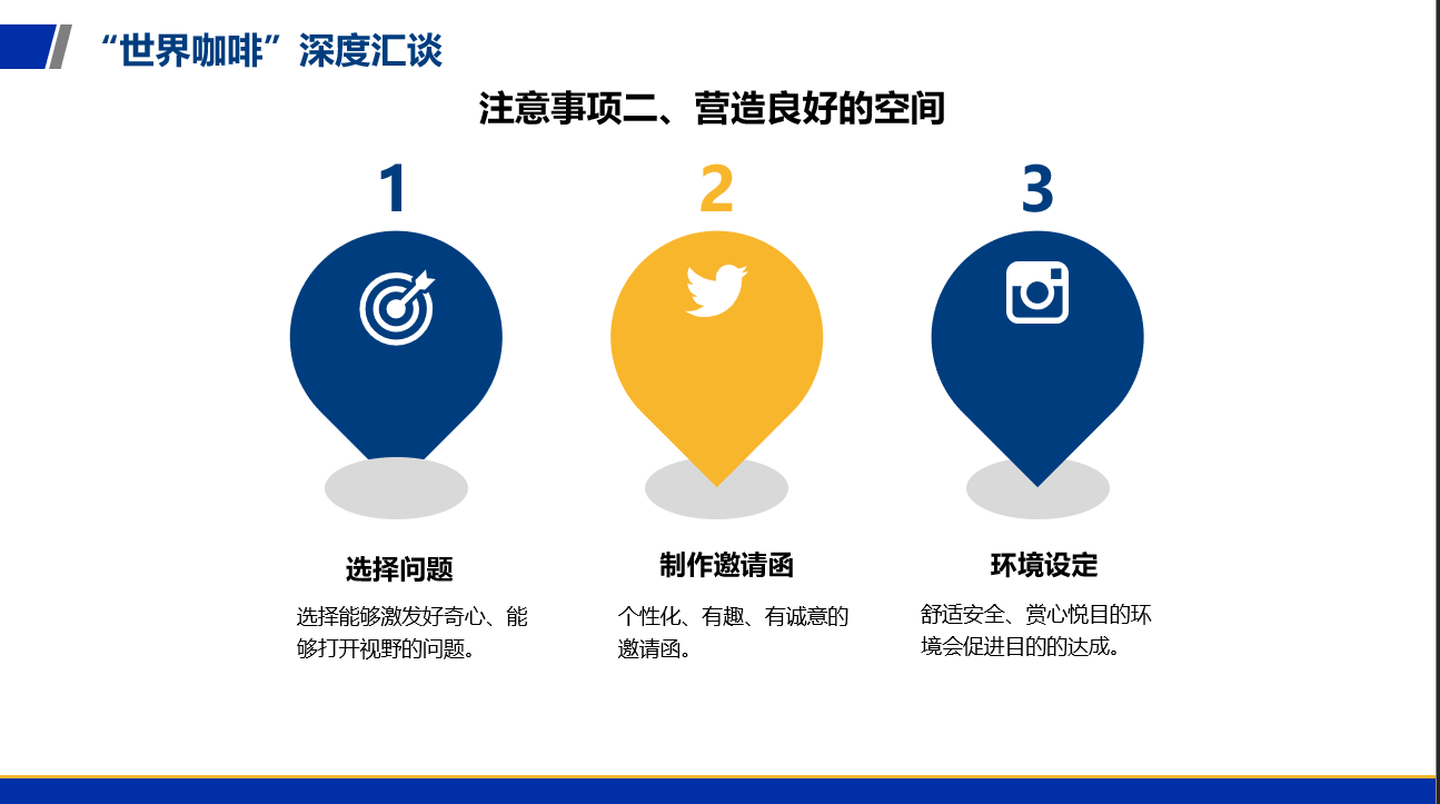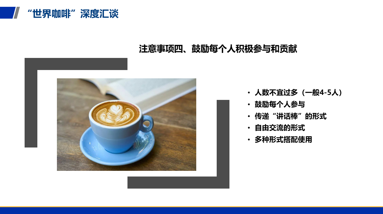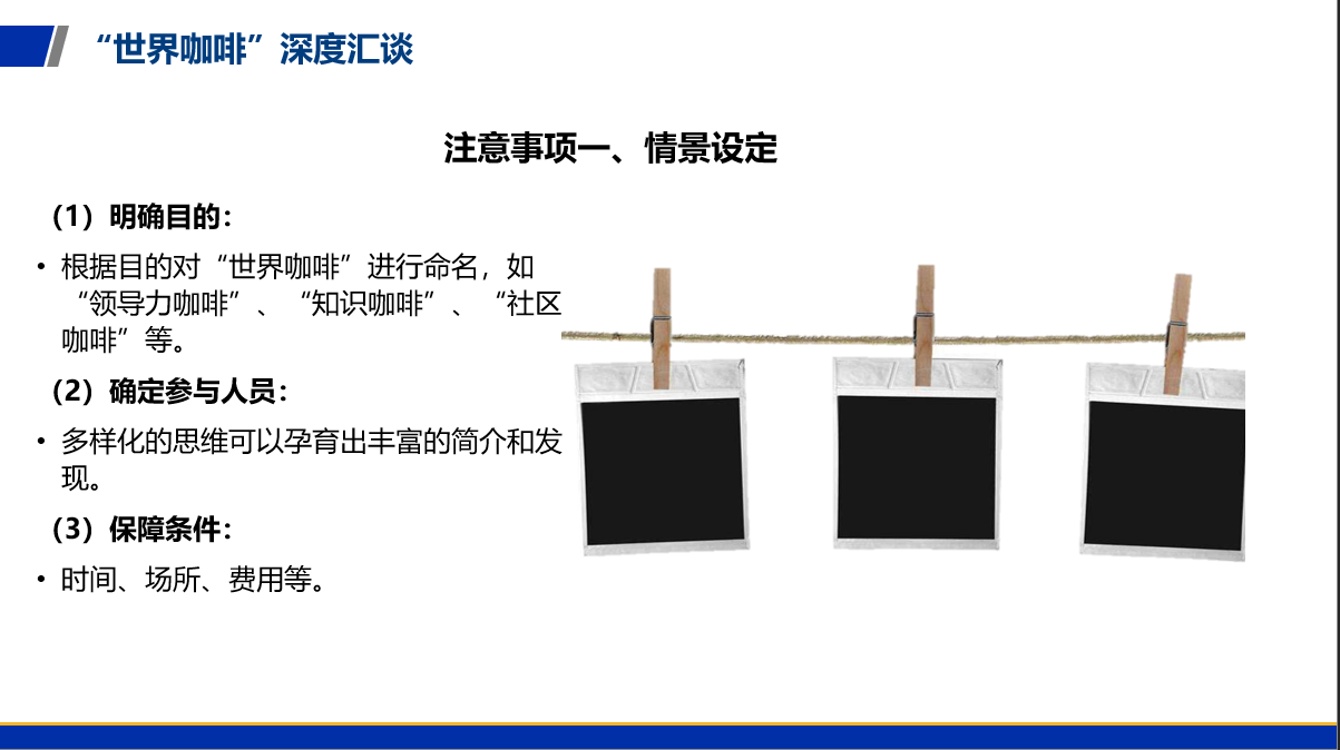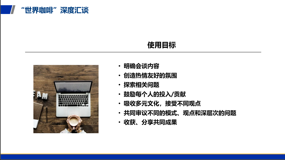 明确目的,根据目的对“世界咖啡”进行命名,如“领导力咖啡”、“知识咖啡”、“社区咖啡”等。