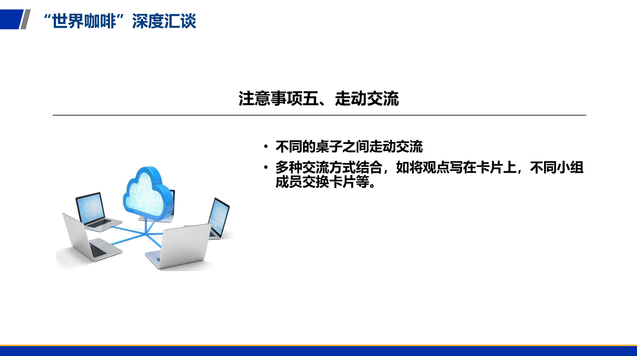 鼓励不同桌子之间走动交流,多种交流方式结合,如将观点写在卡片上,不同小组成员交换卡片等。