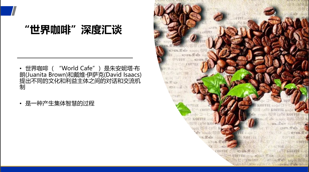 世界咖啡( “World Cafe”)的定义来源于朱安妮塔·布朗(Juanita Brown)和戴维·伊萨克(David Isaacs)提出不同的文化和利益主体之间的对话和交流机制,是一种产生群体智慧的过程。
