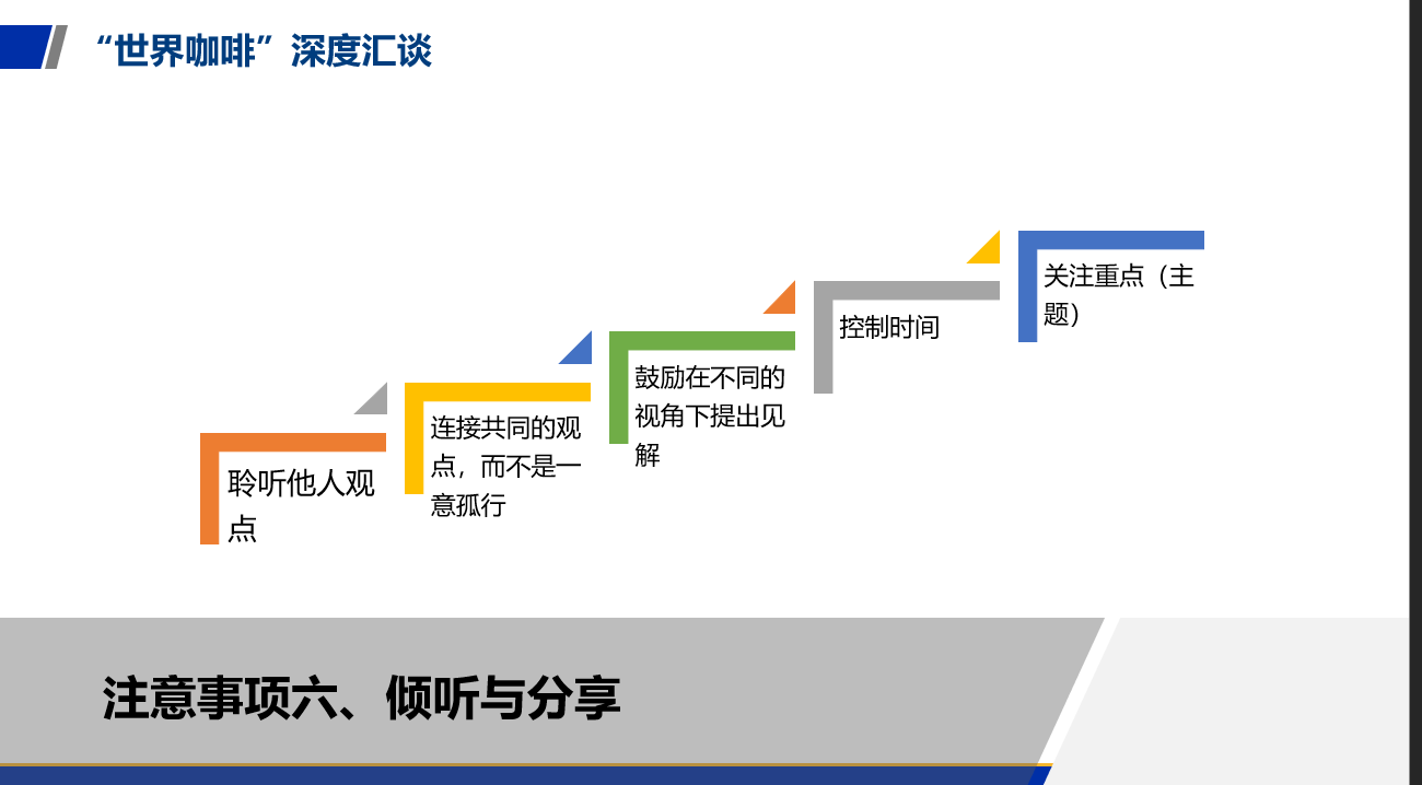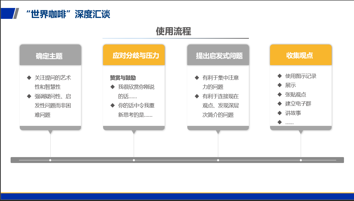 不同其他与组织发展相关的方法, “世界咖啡”深度汇谈需要遵循它自有的基本流程,包括主题确定、应对措施、应对突发问题的处置、观点收集汇总等等。