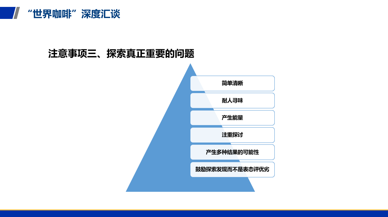 并且,关注提出启发式的探索性问题。应该关注研讨汇谈关注的目标,提出的话题应该围绕集中研讨的主题、并且有利于连接现在的观点和看法,在已有的基础上提出新的、更深层次的问题,深挖问题核心。