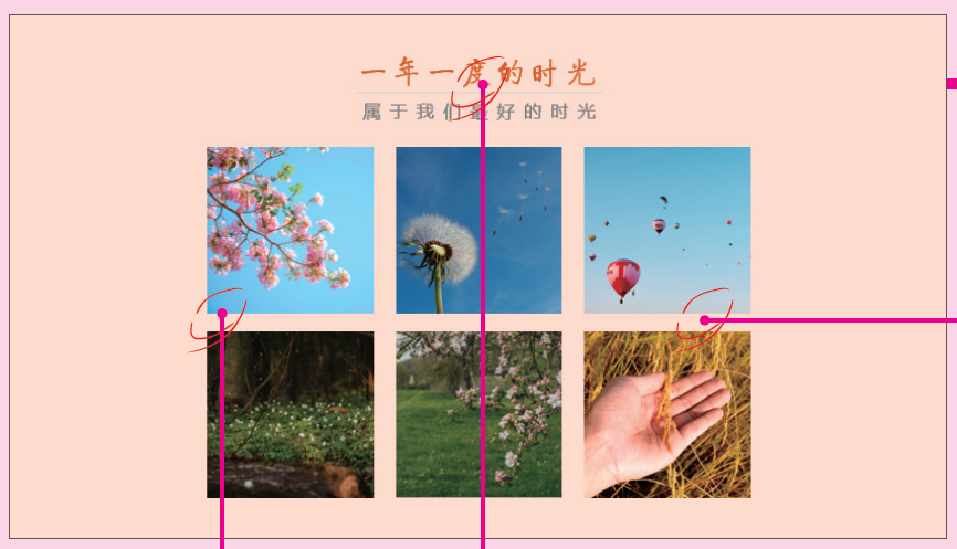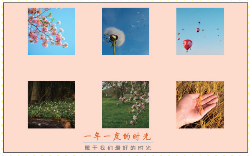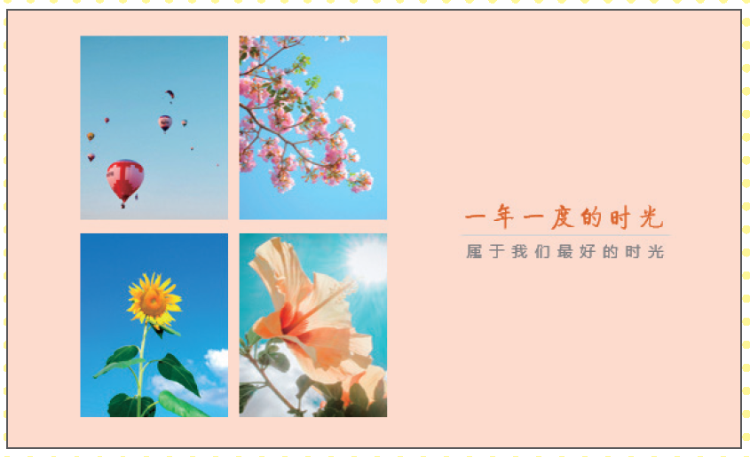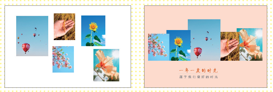一、整齐。在对图片进行分布时,整齐是首先要考虑的问题。如图片的纵横比一致、对齐方式要统一。下左图中图片排列很零乱。将图片设置按纵横比裁剪后,其图片大小一样,将其进行底端对齐,然后添加相关元素修饰,可见整体感觉也是相当整齐的,效果如下右图所示。