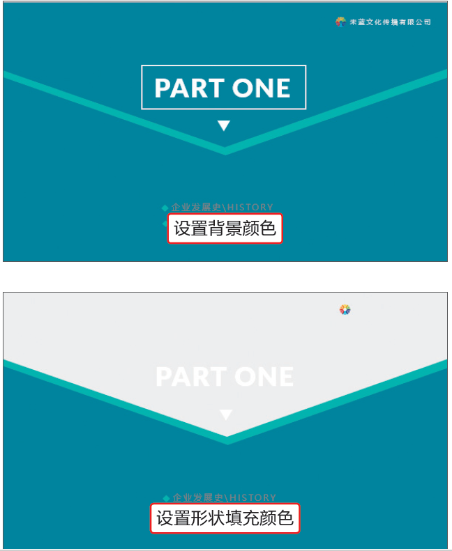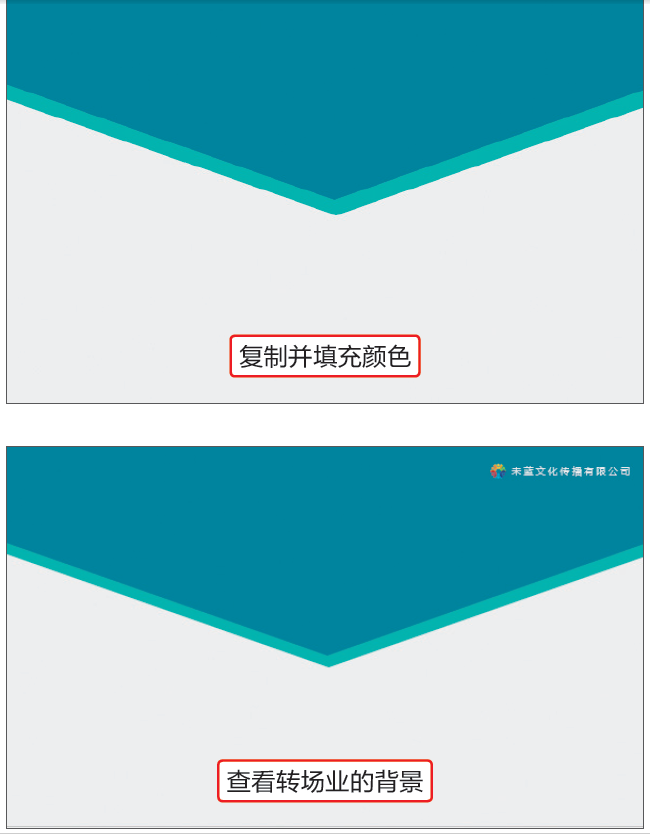 二、色调风格一致。章转场页设置完成,节转场页要和章转场页保持风格,直接更改文本内容,然后设置上方五边形的填充颜色以及页面的背景色即可。