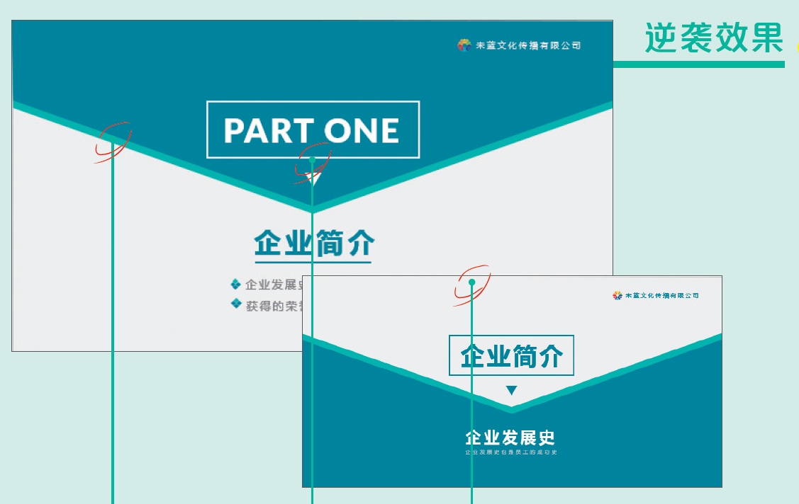 职场君分析:小白制作的章节转场页,整体风格有差异,显得不像是一个整体;在章转场页的序号用大写的壹字表示,显得不合群,比较适合中国风的PPT而不适合商务PPT;形状和页面的过渡颜色对比太强烈、刺眼,使人感觉不适。