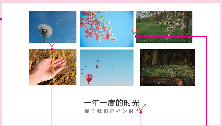 图片是PPT中很常见的一种元素,如果将多张漂亮的、美好的、值得回忆的照片放在一起,也是一件很有意思的事情。图片的拼贴可以适合个人一次邂逅旅游的照片,也可以是企业一次春游或拉练的照片。将这些照片制作成拼贴效果,很值珍惜和拉拢人与人之间的距离。当然在制作图片拼贴时,还应用注意图片的大小、位置的摆放等,如果大小不一致或位置不合理,会让人感觉很别扭。