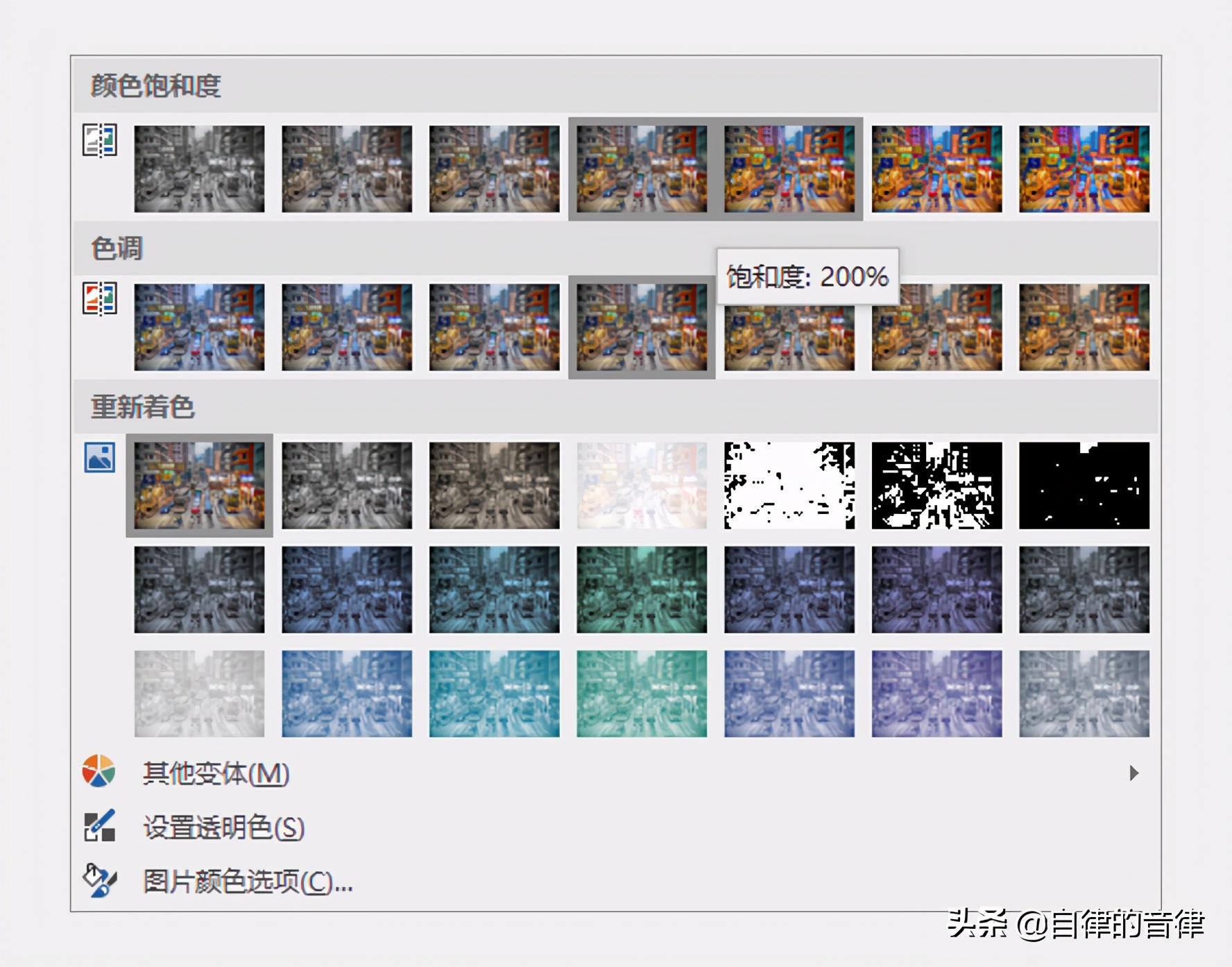 首先,我们点击图片【颜色】,提高图片的饱和度,比如设置成 200%
