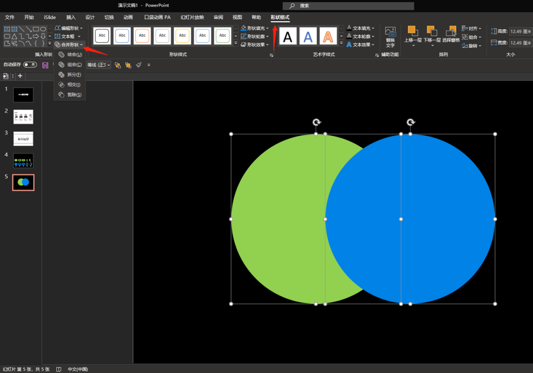 我们插入两个形状,全部选中之后,菜单栏就会出现格式菜单,下面就有合并形状工具。