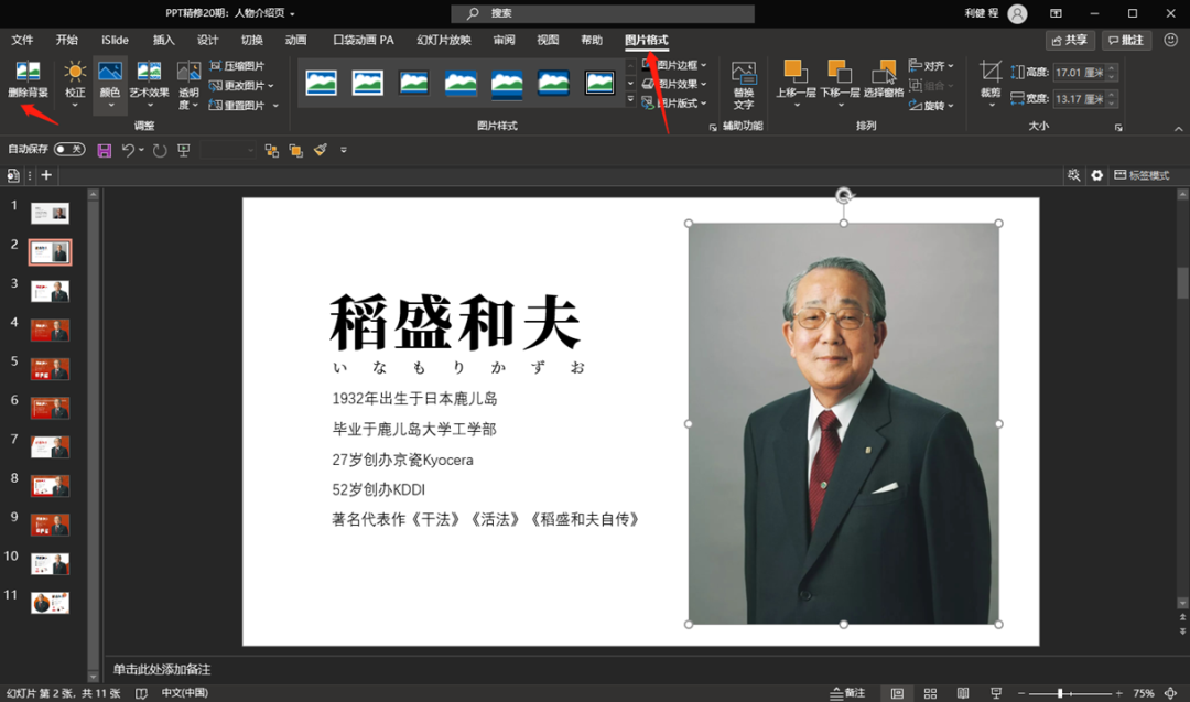 操作非常简单,我们选中人物照片,上面菜单栏就会出现【图片格式】的选项,在图片格式下,有一个删除背景。