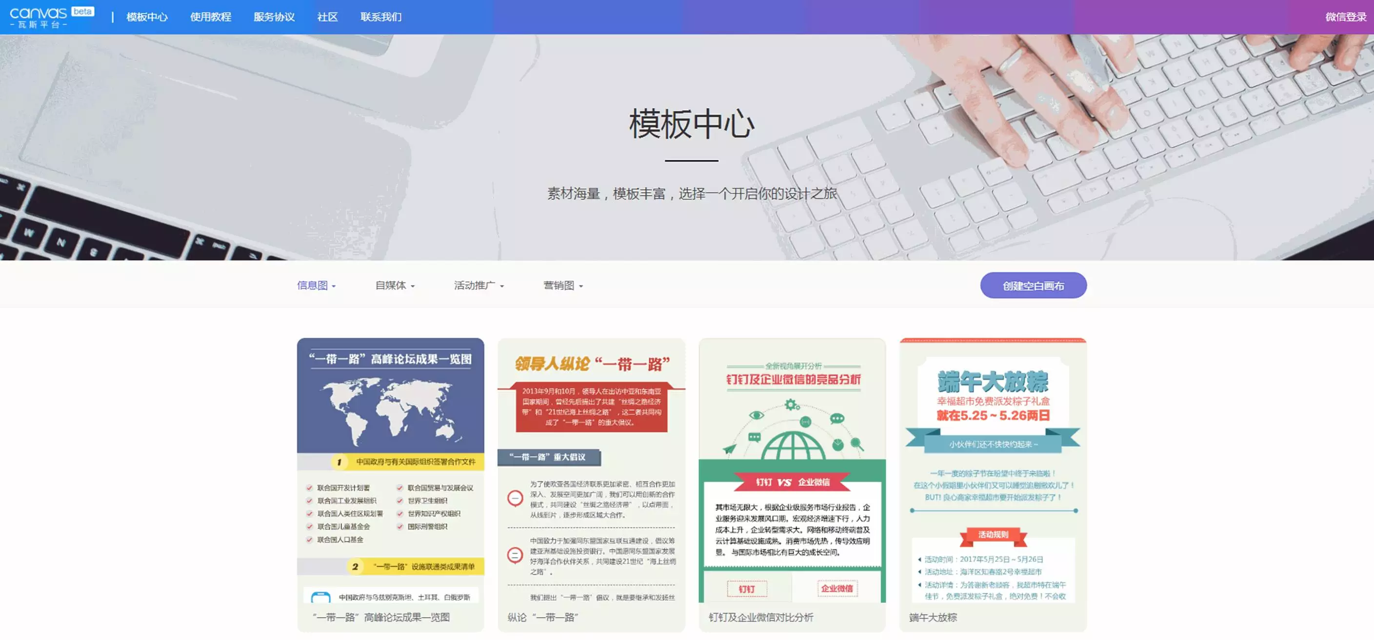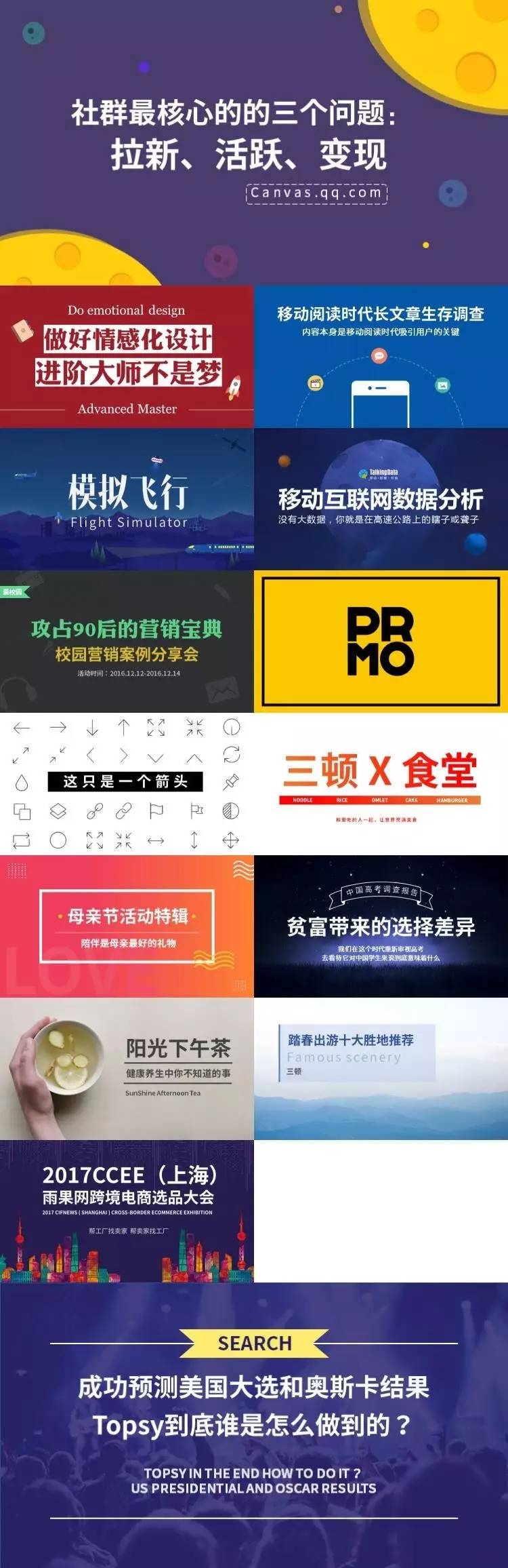 CANVAS是腾讯做的一个在线设计工具,很少人知道,但非常强大。提供了很多可编辑的模板。信息图表,微信图文封面都可以直接制作,感兴趣的话可以去尝试一下(可惜有水印)