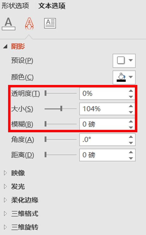 再比如文字【阴影】,将阴影透明度、模糊度都改为「0」即可: