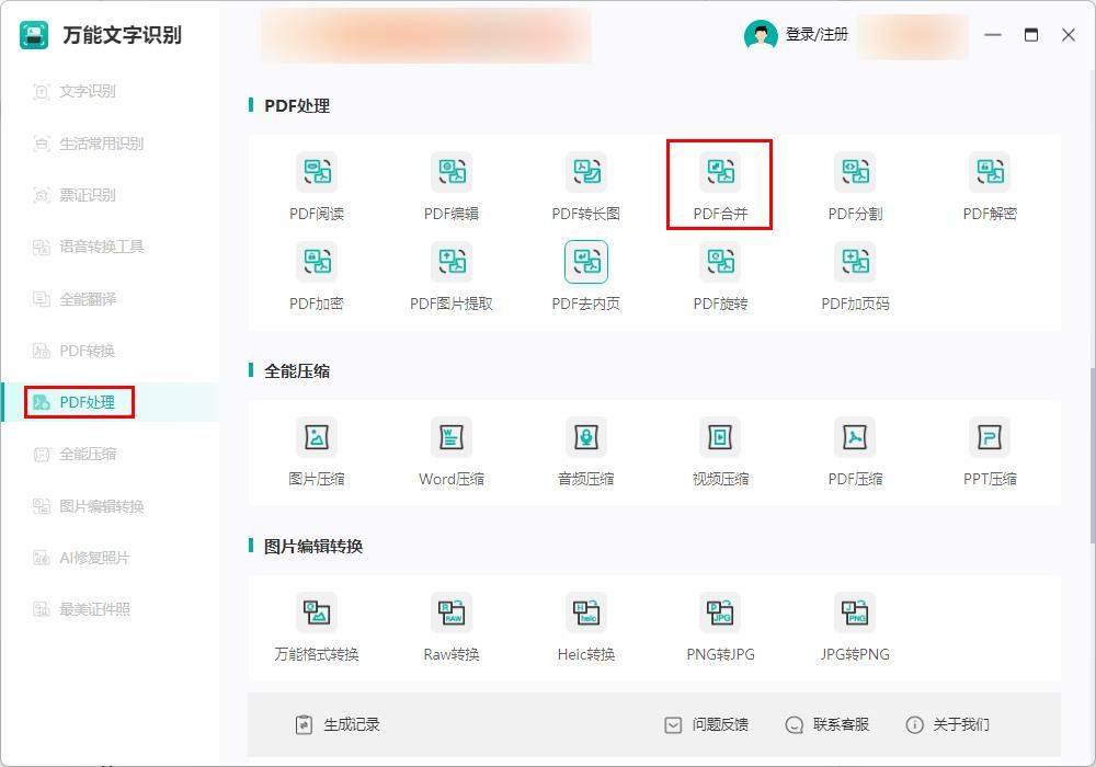 ①选择左侧菜单栏里的【PDF处理】,点击【PDF合并】。