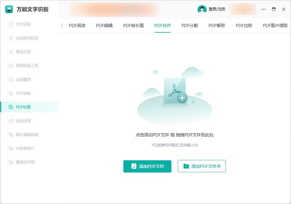 ②将我们的PDF导入到软件中,单文件选择【添加PDF文件】,多个文件选择【添加PDF文件夹】,或者直接把文件拖拽到软件中。