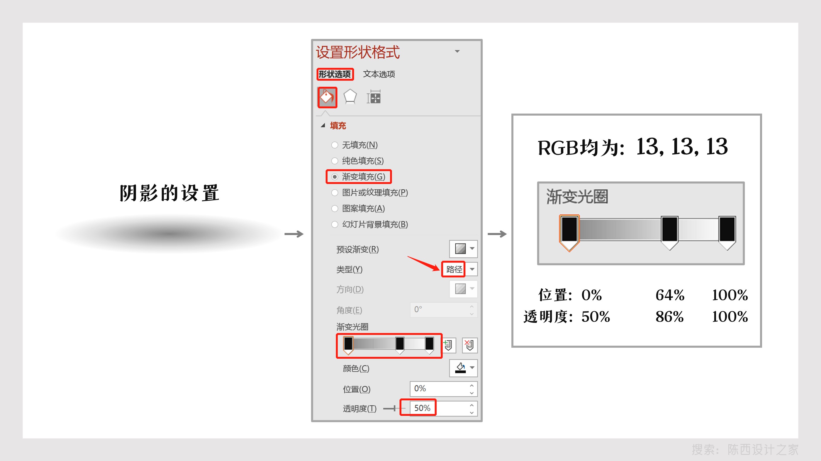 使用三个渐变滑块,滑块颜色均为黑色,注意滑块位置和透明度的调节,可以参考上图。