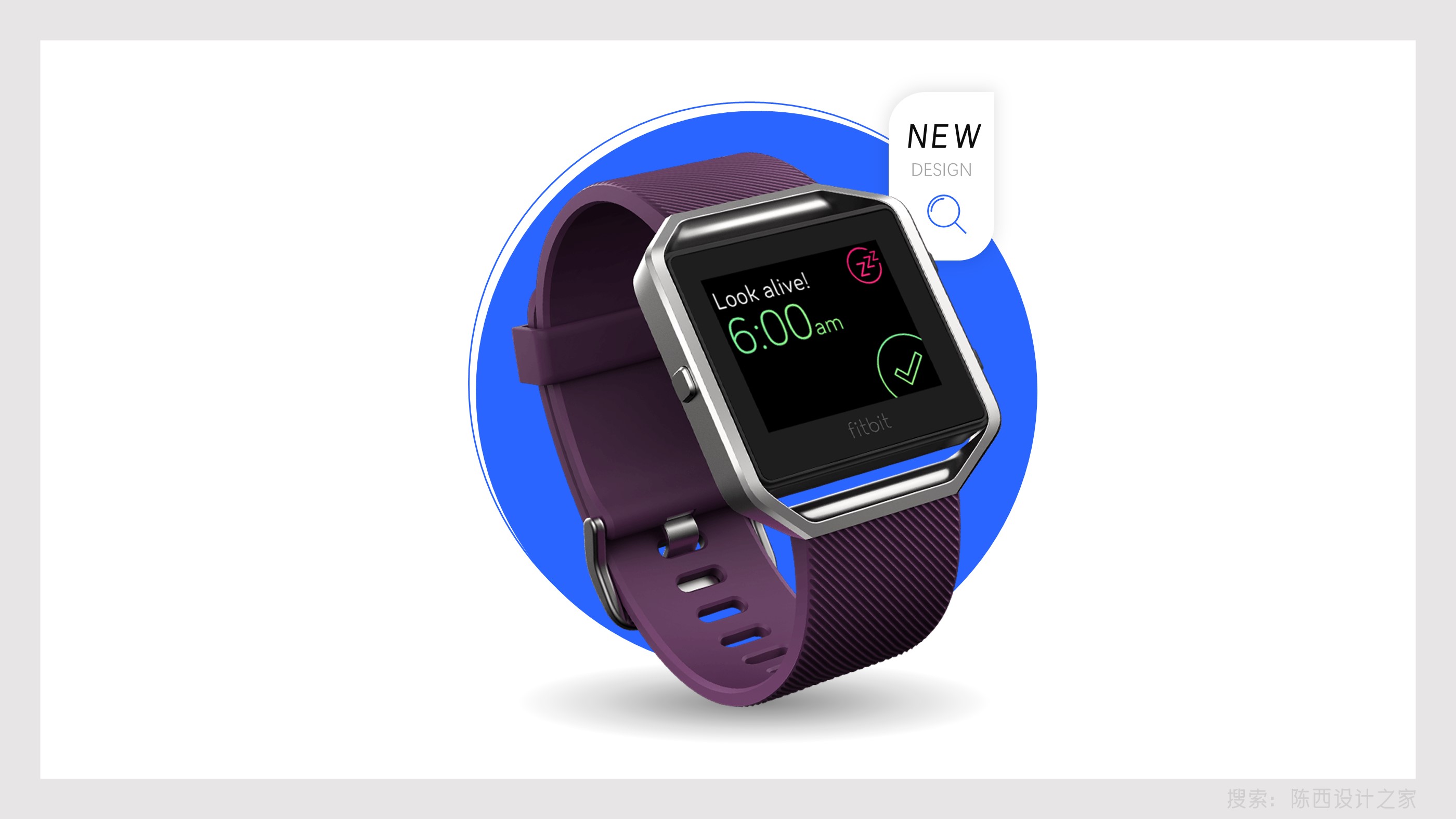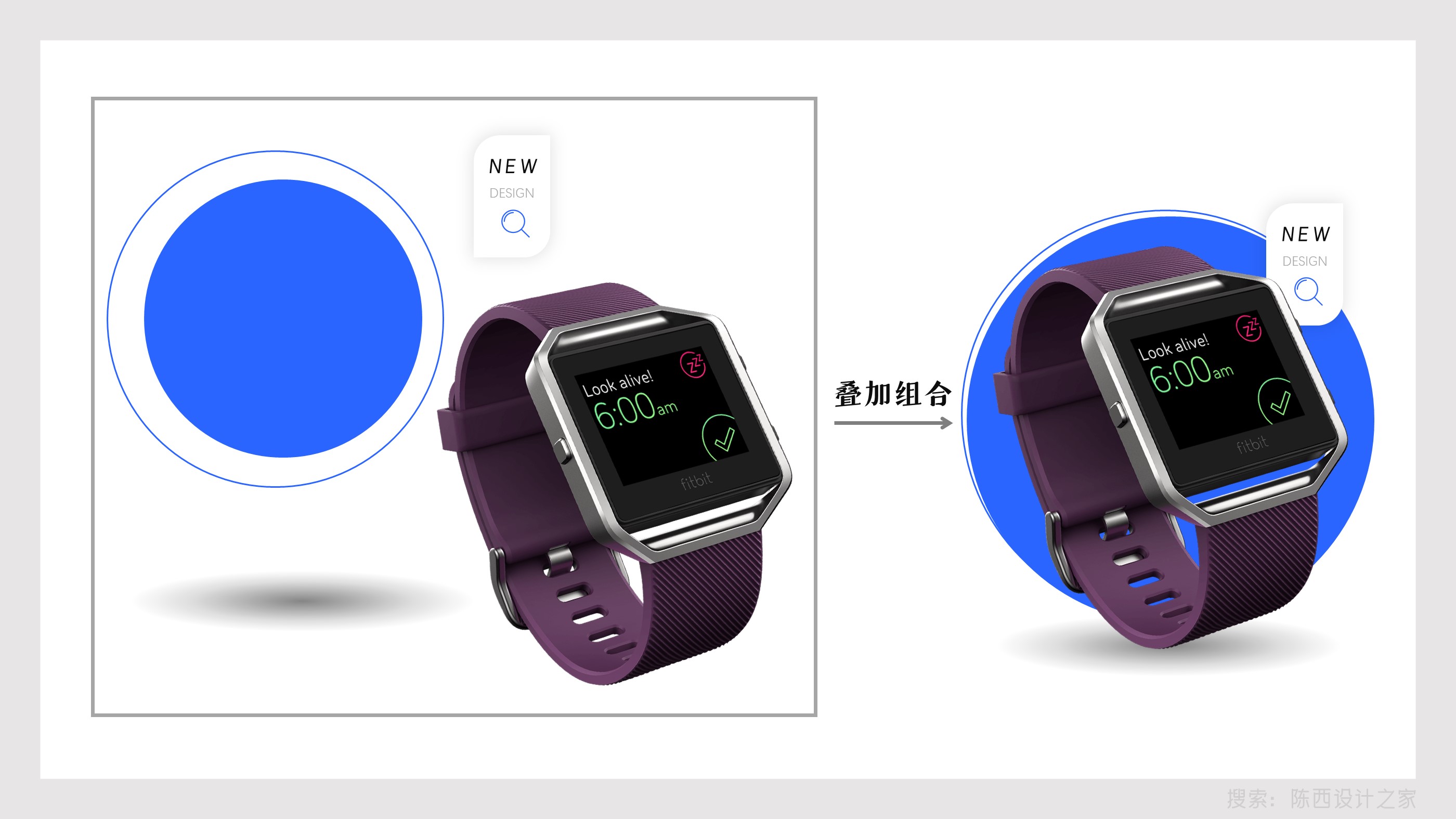 底层是圆形以及圆形线框,中间有一个白色的圆角对角矩形,最上方是智能手表图片,智能手表的下方是阴影。