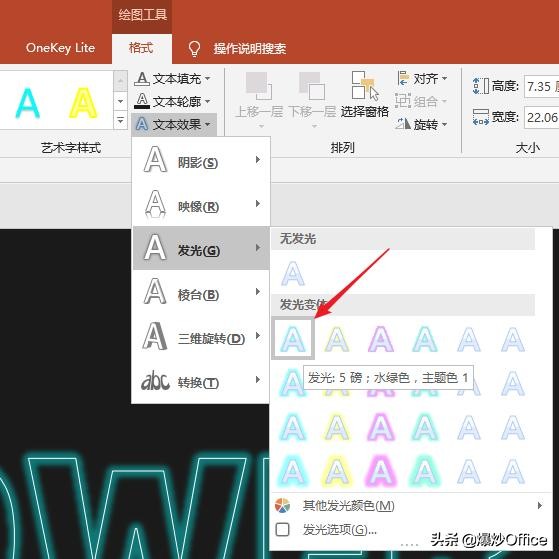 选中文本框,给文字应用一种发光效果