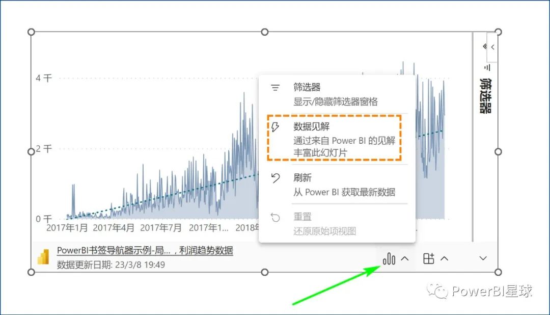 点击嵌入到PPT中的图表下方的数据选项按钮,选择“数据见解”,如下图: