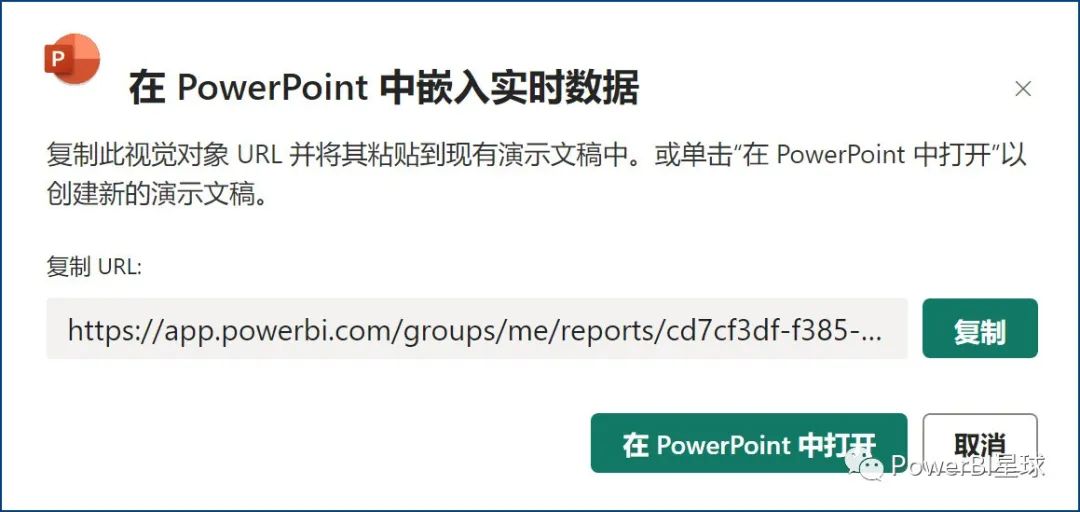 然后打开PPT,插入PowerBI加载项,将复制的URL粘贴进去就可以了,或者你也可以直接点击“PowerPoint中打开”按钮,这个图表就嵌入到PPT中了: