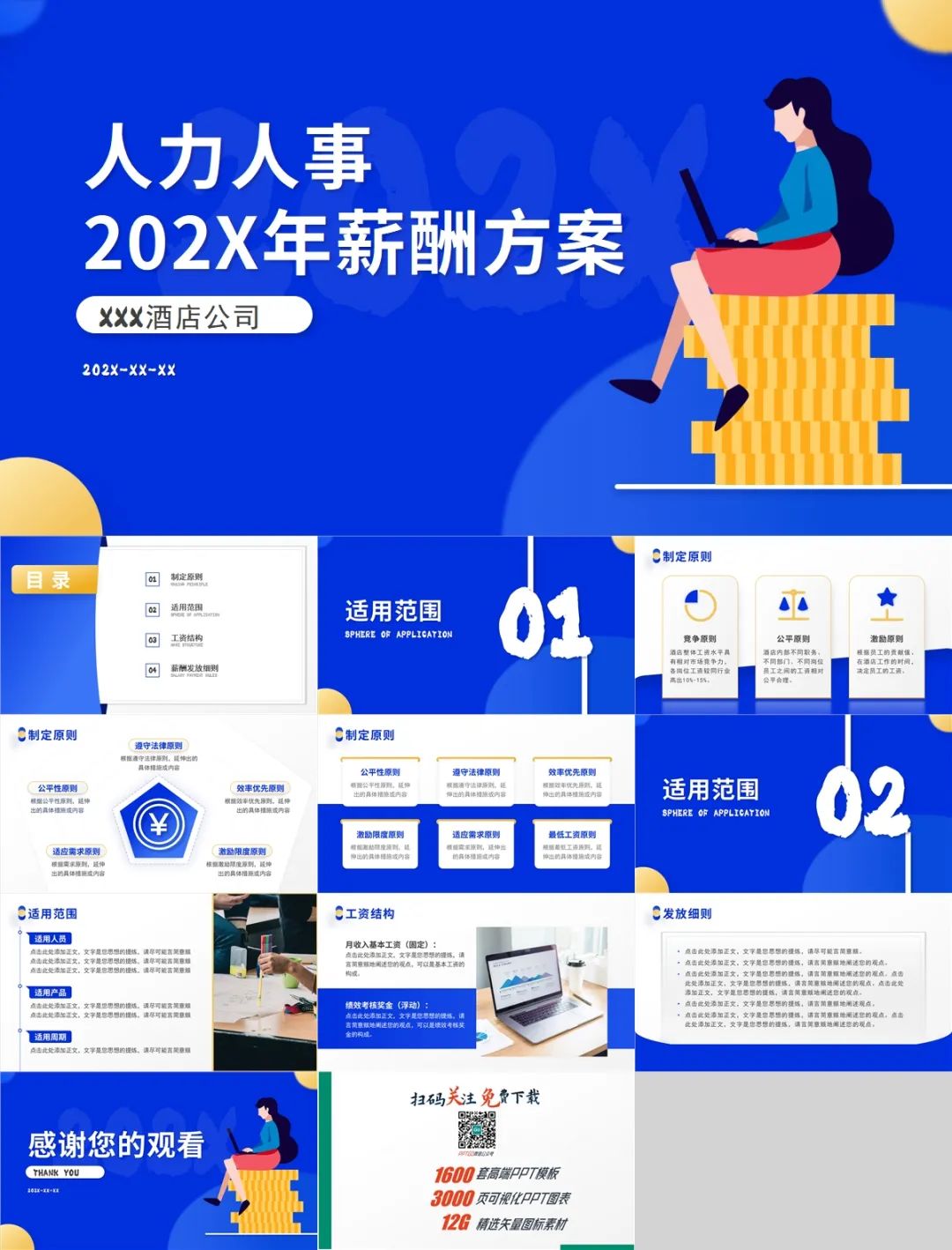 1.大家好,我是PPTGo,一条PPT狗今天分享3款超漂亮的人力资源题材PPT人力人事薪酬方案ppt模板这个款PPT以克莱因蓝为背景色,采用了最近几年的插画风格
