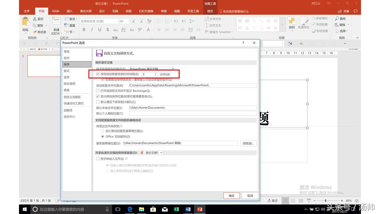接着我们来到保存选项,我们要把这个自动保存时间间隔给缩短。一般设置为3到5分钟就好了。这样就可以避免在做幻灯片中,万一闪退后内容过多地消失的风险。